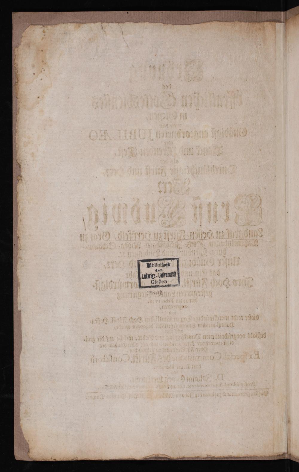Ordnung des öffentlichen Gottesdienstes in Giessen : an dem Gnädigst angeordneten Jubilæo oder Danck- und Freuden-Fest, als der Durchläuchtigste Fürst und Herr, Herr Ernst Ludwig, Landgraf zu Hessen, Fürst zu Herßfeld, Graf zu Catzenelnbogen, Dietz, Ziegenhain, Nidda, Schaumburg, Ysenburg und Büdingen [et]c. Unser Gnädigster Fürst und Herr, das Ein und Fünffzigste Jahr Ihro Hoch-Fürstl. Durchl. glorwürdigstgeseegneten Landes-Regierung den 17ten Febr. 1738. angetretten, und dieser recht merckwürdige Tag in sämtlichen Hoch-Fürstl. Hessen-Darmstättischen Landen feyerlichst begangen wurde : nebst einer deßfals vorgeschiebenen Dancksagung und Gebet, welche auf die gnädigst-verordnete Texte gerichtet, und auf allen Cantzeln des Ober-Fürstenthums zu gebrauchen / Ex speciali Commissione des Fürstl. Consistorii dem Druck übergeben von D. Johann Georg Liebknecht, Prof. publ. ord. Superintendente, wie auch den Consistorii daselbst Assessore