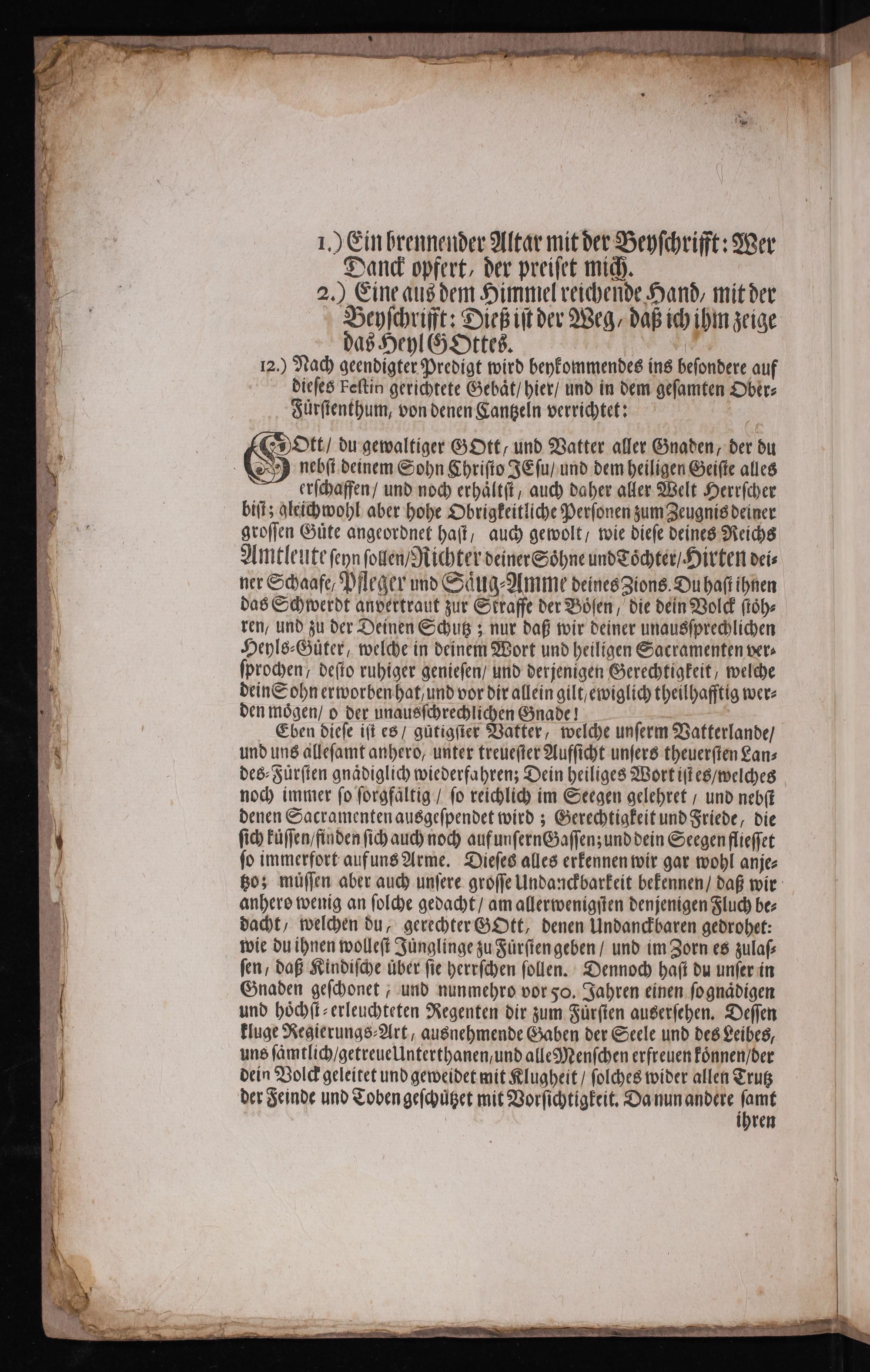 1.) Ein brennender Altar mit der Beyſchrifft: Wer Danck opfert, der preiſet mich. 2.) Eine aus dem Himmel reichende Hand, mit der Beyſchrifft: Dieß iſt der Weg, daß ich ihm zeige das Heyl G Ottes. 1N N. 12.) Nach geendigter Predigt wird beykommendes ins beſondere auf ddieſes Feſtin gerichtete Gebaͤt/ hier/ und in dem geſamten Ober⸗ Fürſtenthum, von denen Cantzeln verrichtet: 4