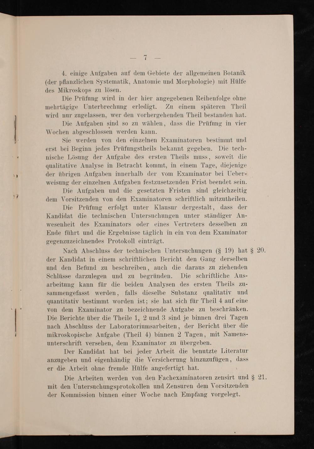 Nach Abschluss der technischen Untersuchungen(§ 19) hat der Kandidat in einem schriftlichen Bericht den Gang derselben und den Befund zu beschreiben, auch die daraus zu ziehenden Schlüsse darzulegen und zu begründen. Die schriftliche Aus- arbeitung kann für die beiden Analysen des ersten Theils zu- sammengefasst werden, falls dieselbe Substanz qualitativ und quantitativ bestimmt worden ist; sie hat sich für Theil 4 auf eine von dem Examinator zu bezeichnende Aufgabe zu beschränken. Die Berichte über die Theile 1, 2 und 3 sind je binnen drei Tagen nach Abschluss der Laboratoriumsarbeiten, der Bericht über die mikroskopische Aufgabe(Theil 4) binnen 2 Tagen, mit Namens- unterschrift versehen, dem Examinator zu übergeben.