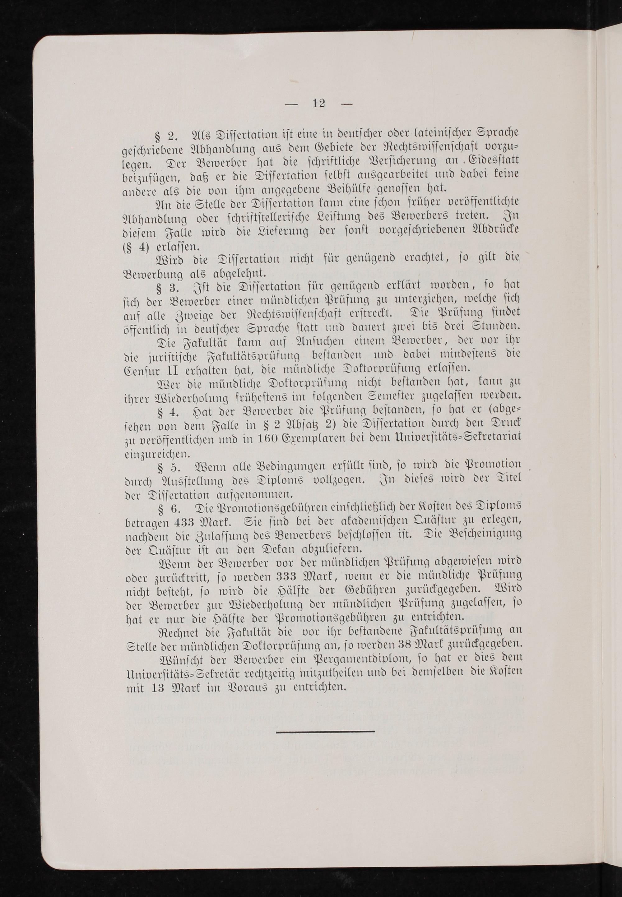 § 3. Iſt die Diſſertation für genügend erklärt worden, ſo hat ſich der Bewerber einer mündlichen Prüfung zu unterziehen, welche ſich auf alle Zweige der Rechtswiſſenſchaft erſtreckt. Die Prüfung findet öffentlich in deutſcher Sprache ſtatt und dauert zwei bis drei Stunden.