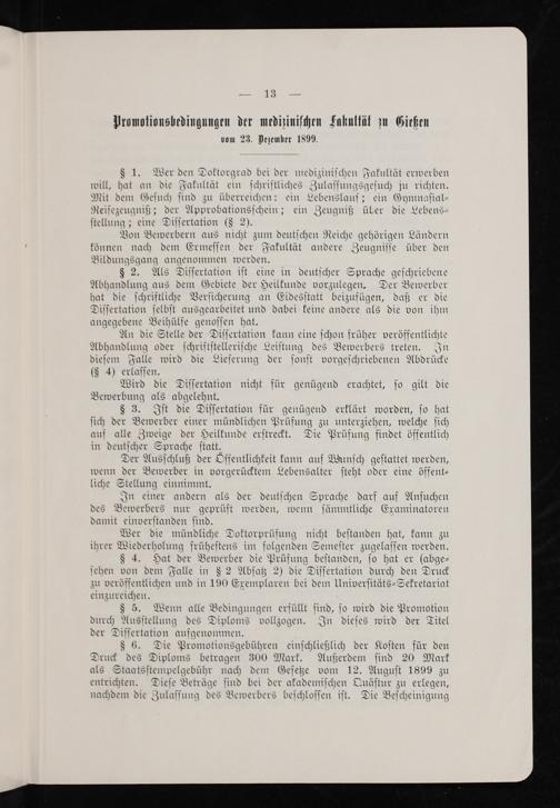 Promotionsbedingungen der mediziniſchen Fakultät zu Gießen vom 23. Dezember 1899.