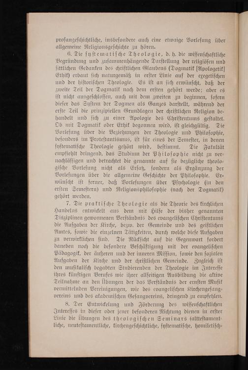 isziplinen gewonnenen Verſtändnis des evangeliſchen Chriſtentums die Aufgaben der Kirche, bezw. der Gemeinde und des geiſtlichen Amtes, ſowie die einzelnen Tätigkeiten, durch welche dieſe Aufgaben zu verwirklichen ſind. Die Rückſicht auf die Gegenwart fordert daneben noch die beſondere Beſchäftigung mit der evangeliſchen Pädagogik, der äußeren und der inneren Miſſion, ſowie den ſozialen Aufgaben der Kirche und der chriſtlichen Gemeinde. Zugleich iſt den muſikaliſch begabten Studierenden der Theologie im Intereſſe ihres künftigen Berufes wie ihrer allſeitigen Ausbildung die aktive Teilnahme an den lbungen der das Verſtändnis der ernſten Muſik vermittelnden Vereinigungen, wie des evangeliſchen Kirchengeſang⸗ vereins und des akademiſchen Geſangvereins, dringend zu empfehlen.