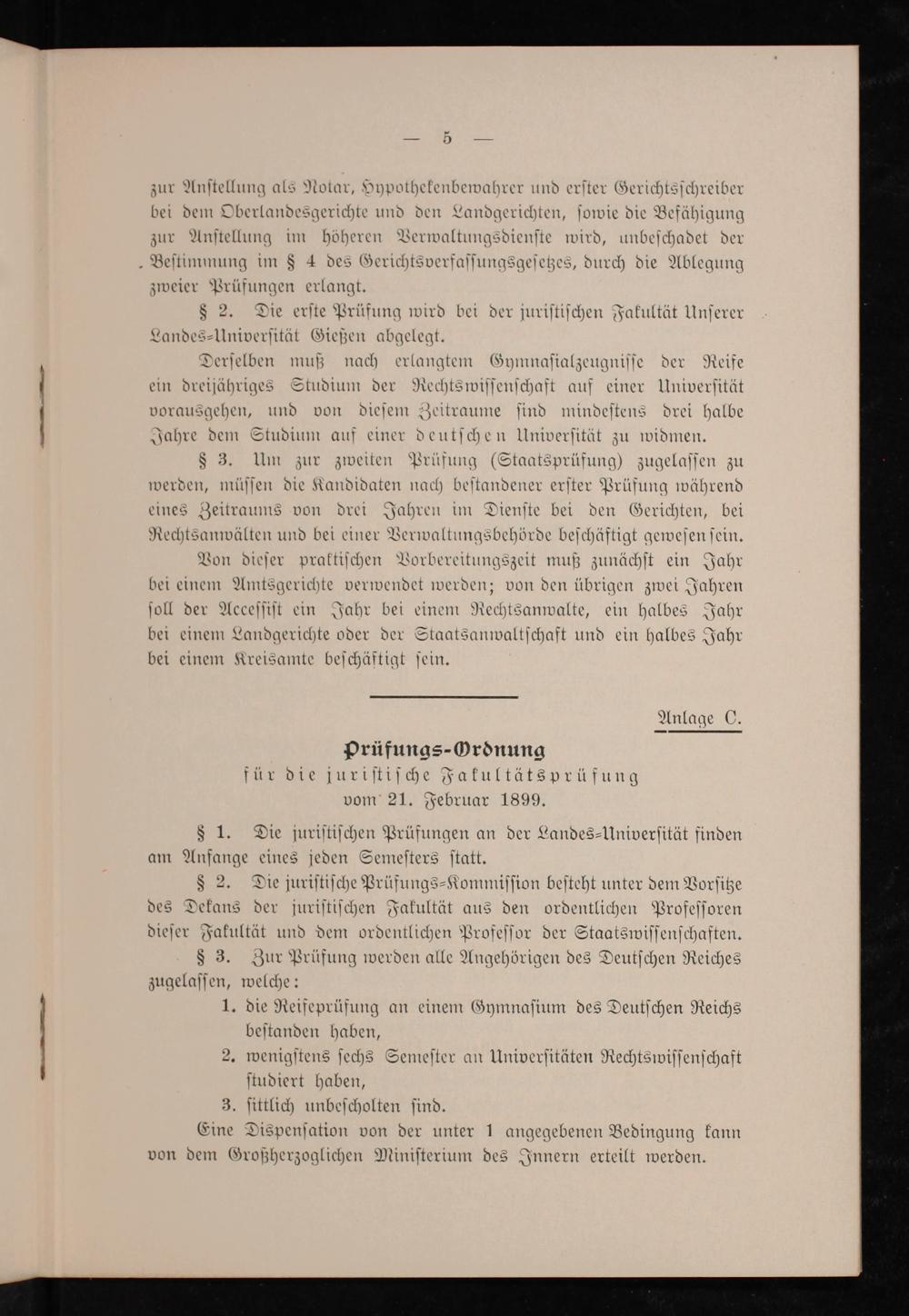 Prüfungs-Ordnung für die juriſtiſche Fakultätsprüfung vom 21. Februar 1899. § 1. Die juriſtiſchen Prüfungen an der Landes⸗Univerſität finden am Anfange eines jeden Semeſters ſtatt. § 2. Die juriſtiſche Prüfungs⸗Kommiſſion beſteht unter dem Vorſitze des Dekans der juriſtiſchen Fakultät aus den ordentlichen Profeſſoren dieſer Fakultät und dem ordentlichen Profeſſor der Staatswiſſenſchaften. § 3. Zur Prüfung werden alle Angehörigen des Deutſchen Reiches zugelaſſen, welche: 1. die Reifeprüfung an einem Gymnaſium des Deutſchen Reichs beſtanden haben, 2. wenigſtens ſechs Semeſter an Univerſitäten Rechtswiſſenſchaft ſtudiert haben, 3. ſittlich unbeſcholten ſind. Eine Dispenſation von der unter 1 angegebenen Bedingung kann von dem Großherzoglichen Miniſterium des Innern erteilt werden.