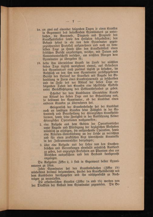 1b. beide ihm überwieſene Kranke im Laufe der nächſten ſieben Tage täglich wenigſtens einmal, auf Erfordern des Examinators auch zweimal täglich zu beſuchen, im Anſchluß an den ihm vom Examinator zurückgegebenen Bericht den Verlauf der Krankheit mit Angabe der Be⸗ handlung in Form eines Krankenjournals zu beſchreiben und im Falle des vor Ablauf der ſieben Tage er⸗ folgenden Todes des Kranken eine ſchriftliche Epikriſe unter Berückſichtigung des Sektionsbefundes zu geben.