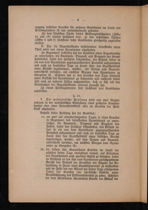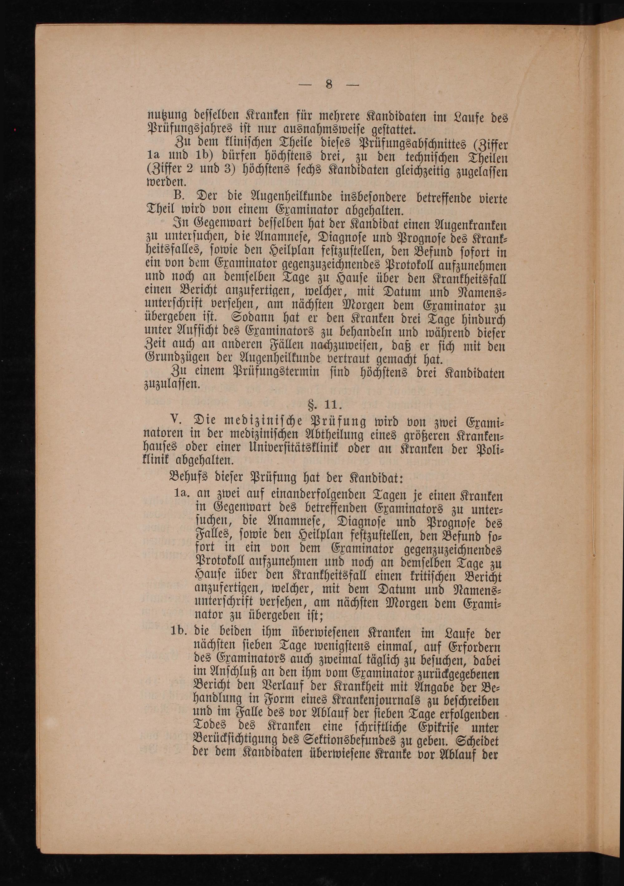 §. 11. V. Die mediziniſche Prüfung wird von zwei Exami⸗ natoren in der mediziniſchen Abtheilung eines größeren Kranken⸗ hauſes oder einer Univerſitätsklinik oder an Kranken der Poli⸗ klinik abgehalten. Behufs dieſer Prüfung hat der Kandidat: G la. an zwei auf einanderfolgenden Tagen je einen Kranken in Gegenwart des betreffenden Examinators zu unter⸗ ſuchen, die Anamneſe, Diagnoſe und Prognoſe des Falles, ſowie den Heilplan feſtzuſtellen, den Befund ſo⸗ fort in ein von dem Examinator gegenzuzeichnendes Protokoll aufzunehmen und noch an demſelben Tage zu Hauſe über den Krankheitsfall einen kritiſchen Bericht anzufertigen, welcher, mit dem Datum und Namens⸗ unterſchrift verſehen, am nächſten Morgen dem Exami⸗ nator zu übergeben iſt; 1b. die beiden ihm überwieſenen Kranken im Laufe der nächſten ſieben Tage wenigſtens einmal, auf Erfordern des Examinators auch zweimal täglich zu beſuchen, dabei im Anſchluß an den ihm vom Examinator zurückgegebenen Bericht den Verlauf der Krankheit mit Angabe der Be⸗ handlung in Form eines Krankenjournals zu beſchreiben und im Falle des vor Ablauf der ſieben Tage erfolgenden Todes des Kranken eine ſchriftliche Epikriſe unter Berückſichtigung des Sektionsbefundes zu geben. Scheidet der dem Kandidaten überwieſene Kranke vor Ablauf der