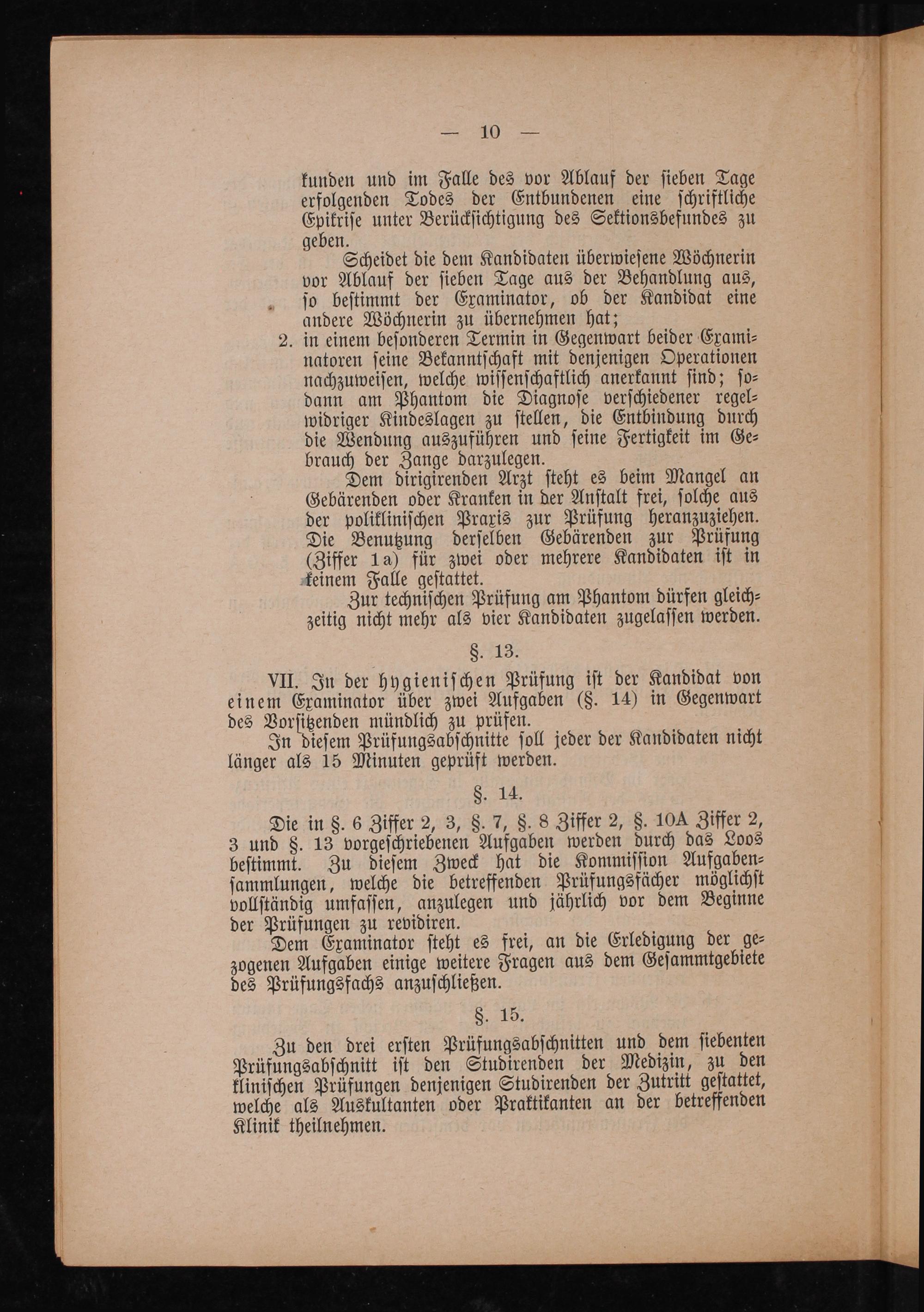 Dem dirigirenden Arzt ſteht es beim Mangel an Gebärenden oder Kranken in der Anſtalt frei, ſolche aus der polikliniſchen Praxis zur Prüfung heranzuziehen. Die Benutzung derſelben Gebärenden zur Prüfung (Ziffer 1 a) für zwei oder mehrere Kandidaten iſt in keinem Falle geſtattet.