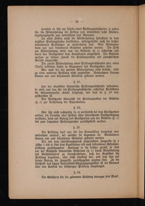 In allen Fällen muß die Wiederholung ſpäteſtens in dem nächſten Prüfungsjahre ſtattfinden, widrigenfalls auch die früher beſtandenen Prüfungen zu wiederholen ſind. Eine Ausnahme kann nur aus beſonderen Gründen geſtattet werden. Die Friſt zur Wiederholung wird von der Behörde(S§. 1) feſtgeſetzt und durch den Vorſitzenden dem Kandidaten mitgetheilt. Der Behörde werden zu dieſem Zwecke die Prüfungsakten mit gutachtlichem Bericht eingereicht.