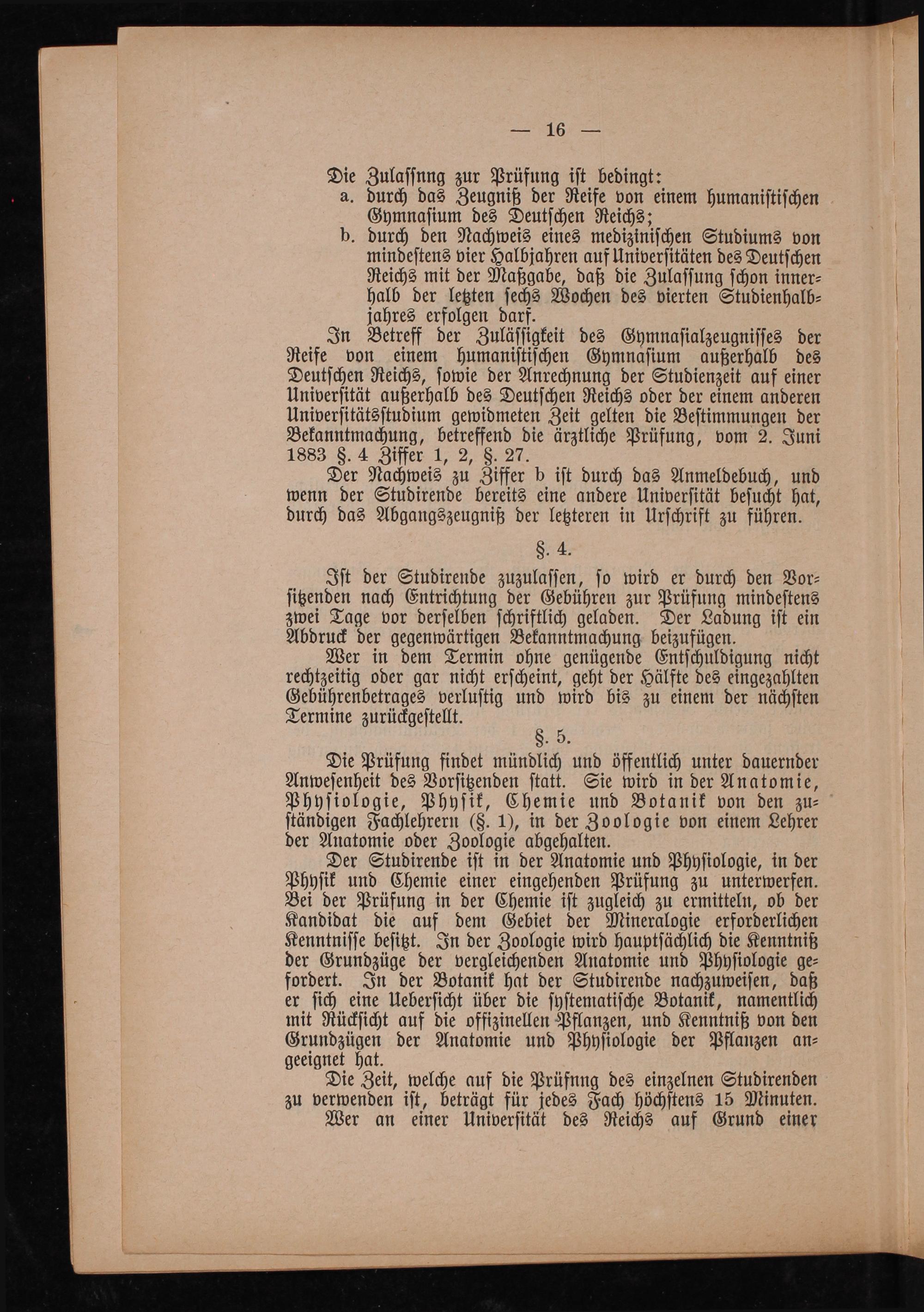 Der Studirende iſt in der Anatomie und Phyſiologie, in der Phyſik und Chemie einer eingehenden Prüfung zu unterwerfen. Bei der Prüfung in der Chemie iſt zugleich zu ermitteln, ob der Kandidat die auf dem Gebiet der Mineralogie erforderlichen Kenntniſſe beſitzt. In der Zoologie wird hauptſächlich die Kenntniß der Grundzüge der vergleichenden Anatomie und Phyſiologie ge⸗ fordert. In der Botanik hat der Studirende nachzuweiſen, daß er ſich eine Ueberſicht über die ſyſtematiſche Botanik, namentlich mit Rückſicht auf die offizinellen Pflanzen, und Kenntniß von den Grundzügen der Anatomie und Phyſiologie der Pflanzen an⸗ geeignet hat.