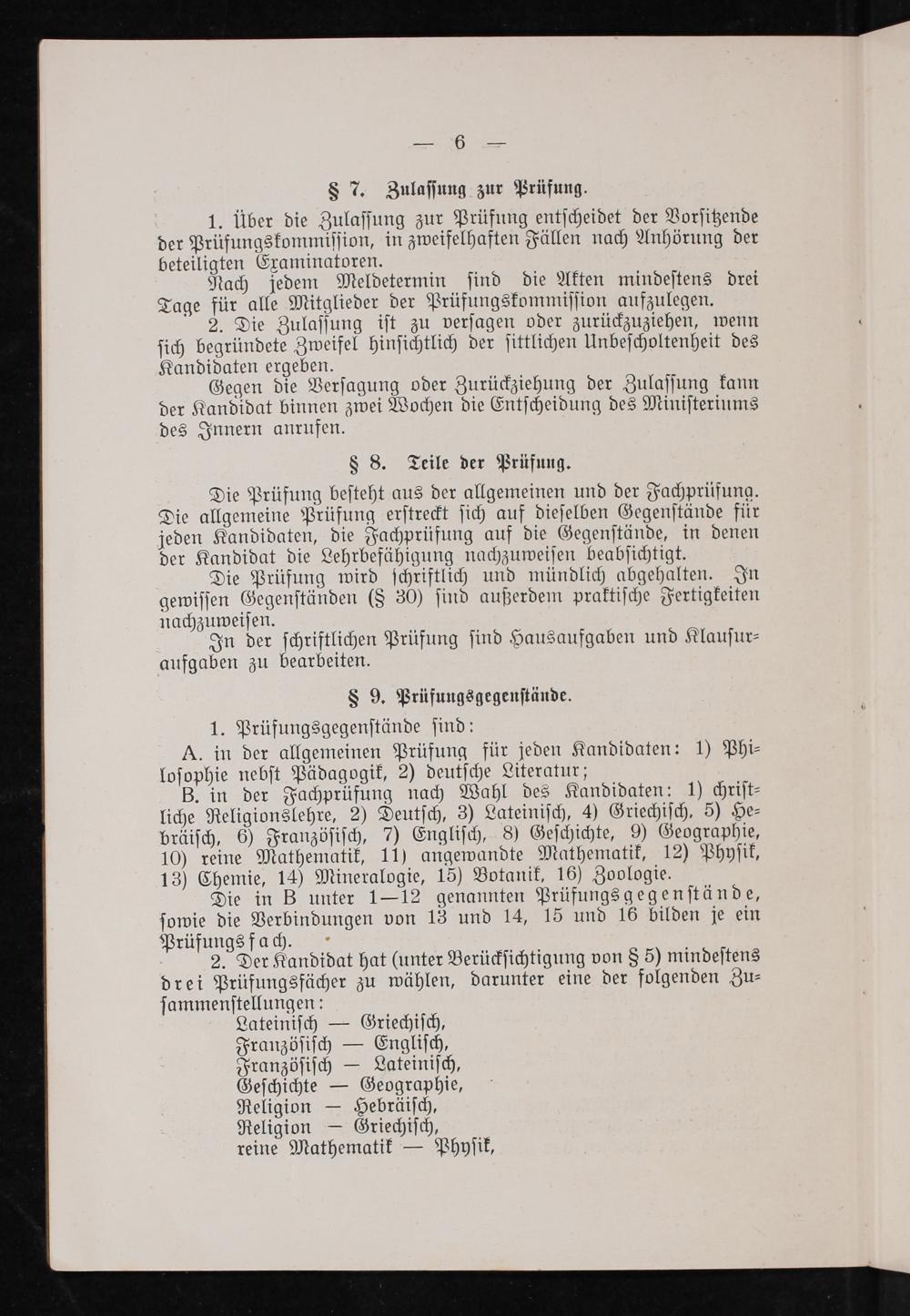 B. in der Fachprüfung nach Wahl des Kandidaten: 1) chriſt⸗ liche Religionslehre, 2) Deutſch, 3) Lateiniſch, 4) Griechiſch, 5) He⸗ bräiſch, 6) Franzöſiſch, 7) Engliſch, 8) Geſchichte, 9) Geographie, 10) reine Mathematik, 11) angewandte Mathematik, 12) Phyſik, 13) Chemie, 14) Mineralogie, 15) Botanik, 16) Zoologie.