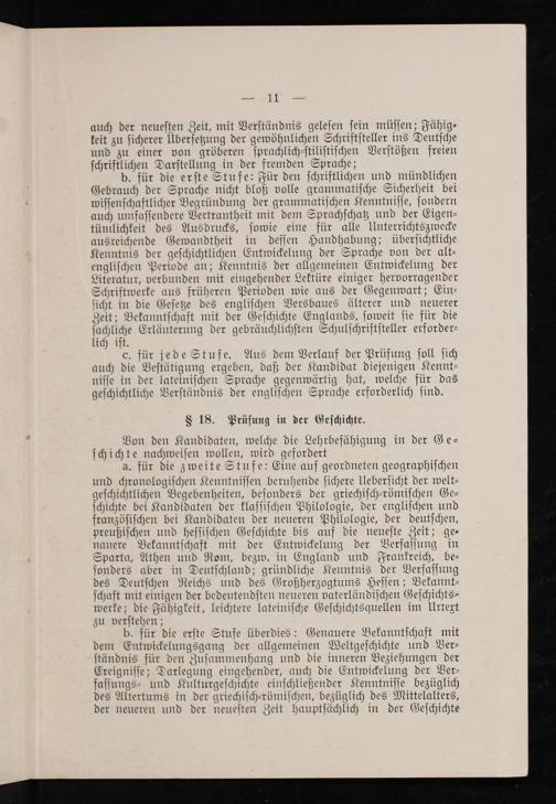 a. für die zweite Stufe: Eine auf geordneten geographiſchen und chronologiſchen Kenntniſſen beruhende ſichere Ueberſicht der welt⸗ geſchichtlichen Begebenheiten, beſonders der griechiſch⸗römiſchen Ge⸗ ſchichte bei Kandidaten der klaſſiſchen Philologie, der engliſchen und franzöſiſchen bei Kandidaten der neueren Philologie, der deutſchen, preußiſchen und heſſiſchen Geſchichte bis auf die neueſte Zeit; ge⸗ nauere Bekanntſchaft mit der Entwickelung der Verfaſſung in Sparta, Athen und Rom, bezw. in England und Frankreich, be— ſonders aber in Deutſchland; gründliche Kenntnis der Verfaſſung des Deutſchen Reichs und des Großherzogtums Heſſen; Bekannt⸗ ſchaft mit einigen der bedeutendſten neueren vaterländiſchen Geſchichts⸗ werke; die Fähigkeit, leichtere lateiniſche Geſchichtsquellen im Urtext zu verſtehen;