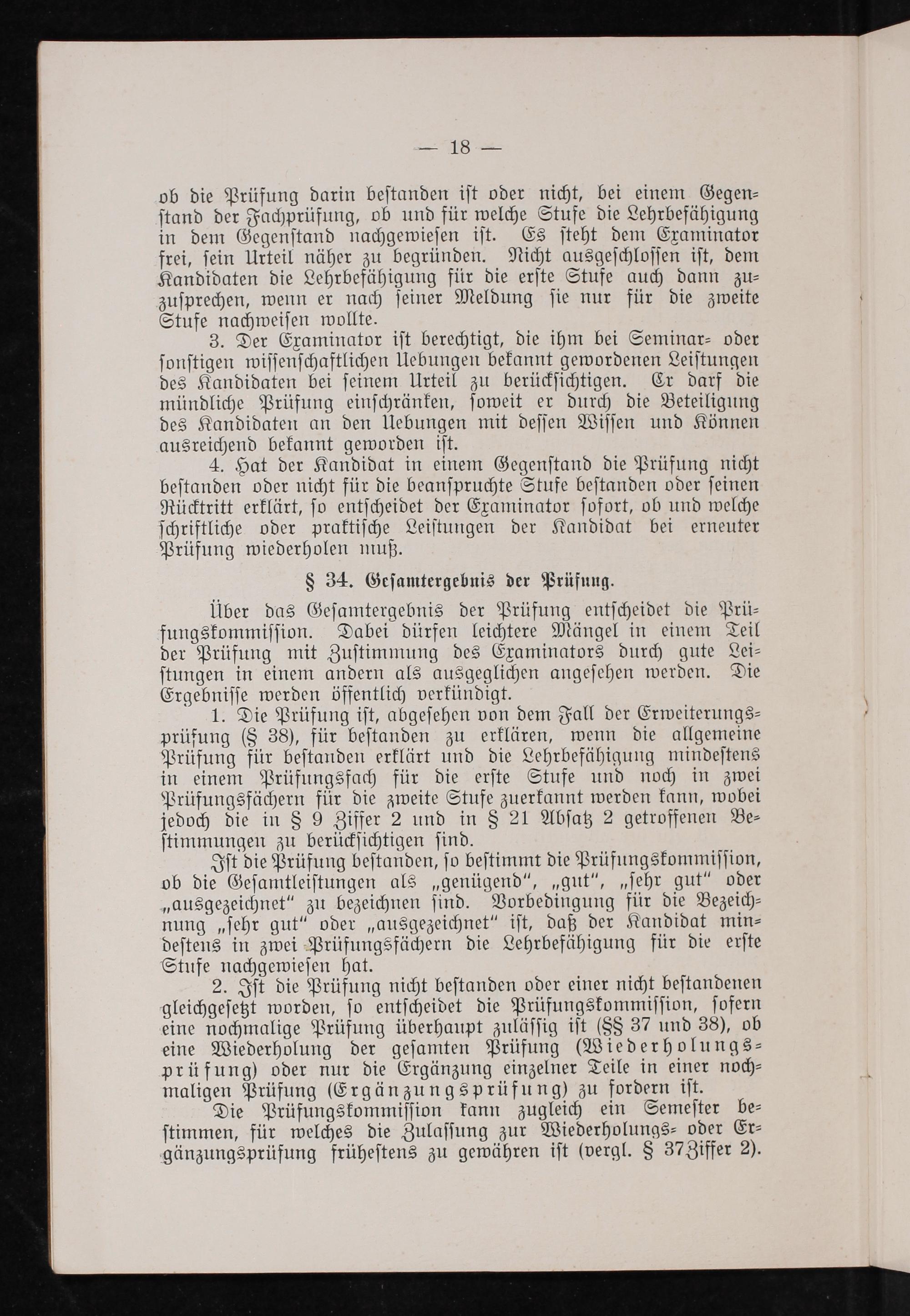 ob die Prüfung darin beſtanden iſt oder nicht, bei einem Gegen⸗ ſtand der Fachprüfung, ob und für welche Stufe die Lehrbefähigung in dem Gegenſtand nachgewieſen iſt. Es ſteht dem Examinator frei, ſein Urteil näher zu begründen. Nicht ausgeſchloſſen iſt, dem Kandidaten die Lehrbefähigung für die erſte Stufe auch dann zu— zuſprechen, wenn er nach ſeiner Meldung ſie nur für die zweite Stufe nachweiſen wollte.