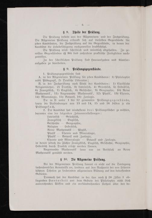 B. in der Fachprüfung nach Wahl des Kandidaten: 1) Chriſtliche Religionslehre, Deutſch, 3) Lateiniſch, 4) Griechiſch, 5) Hebräiſch, 6) Franzöſiſch, Engliſch, 8) Geſchichte, 9) Geographie, 10) Reine Mathematik, 11) Angewandte Mathematik, 12) Phyſik, 13) Chemie, 14) Mineralogie, 15) Botanik, 16) Zoologie.