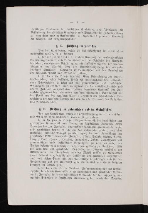 b. für die erſte Stufe überdies: Zuſammenhängende und wiſſen⸗ ſchaftlich begründete Kenntniſſe in der lateiniſchen und griechiſchen Gram⸗ matik; Fertigkeit im freien ſchriftlichen Gebrauche der lateiniſchen, gram— matiſche Sicherheit in ſchriftlicher Anwendung der griechiſchen Sprache,