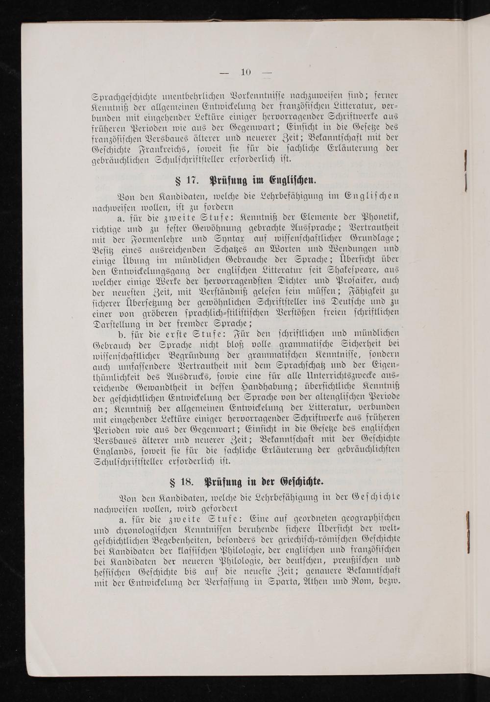 b. für die erſte Stufe: Für den ſchriftlichen und mündlichen Gebrauch der Sprache nicht bloß volle grammatiſche Sicherheit bei wiſſenſchaftlicher Begründung der grammatiſchen Kenntniſſe, ſondern auch umfaſſendere Vertrautheit mit dem Sprachſchatz und der Eigen— thümlichkeit des Ausdrucks, ſowie eine für alle Unterrichtszwecke aus⸗ reichende Gewandtheit in deſſen Handhabung; überſichtliche Kenntniß der geſchichtlichen Entwickelung der Sprache von der altengliſchen Periode an; Kenntniß der allgemeinen Entwickelung der Litteratur, verbunden mit eingehender Lektüre einiger hervorragender Schriftwerke aus früheren Perioden wie aus der Gegenwart; Einſicht in die Geſetze des engliſchen Versbaues älterer und neuerer Zeit; Bekanntſchaft mit der Geſchichte Englands, ſoweit ſie für die ſachliche Erläuterung der gebräuchlichſten Schulſchriftſteller erforderlich iſt.