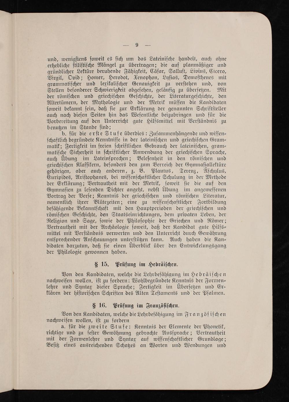 § 16. Prüfung im Franzöſiſchen. Von den Kandidaten, welche die Lehrbefähigung im Franzöſiſchen nachweiſen wollen, iſt zu fordern a. für die zweite Stufe: Kenntnis der Elemente der Phonetik, richtige und zu feſter Gewöhnung gebrachte Ausſprache; Vertrautheit mit der Formenlehre und Sontax auf wiſſenſchaftlicher Grundlage; Beſitz eines ausreichenden Schatzes an Worten und Wendungen und