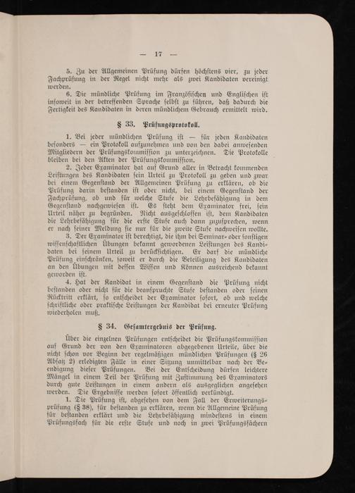2. Jeder Examinator hat auf Grund aller in Betracht kommenden Leiſtungen des Kandidaten ſein Urteil zu Protokoll zu geben und zwar bei einem Gegenſtand der Allgemeinen Prüfung zu erklären, ob die Prüfung darin beſtanden iſt oder nicht, bei einem Gegenſtand der Fachprüfung, ob und für welche Stufe die Lehrbefähigung in dem Gegenſtand nachgewieſen iſt. Es ſteht dem Examinator frei, ſein Urteil näher zu begründen. Nicht ausgeſchloſſen iſt, dem Kandidaten die Lehrbefähigung für die erſte Stufe auch dann zuzuſprechen, wenn er nach ſeiner Meldung ſie nur für die zweite Stufe nachweiſen wollte.