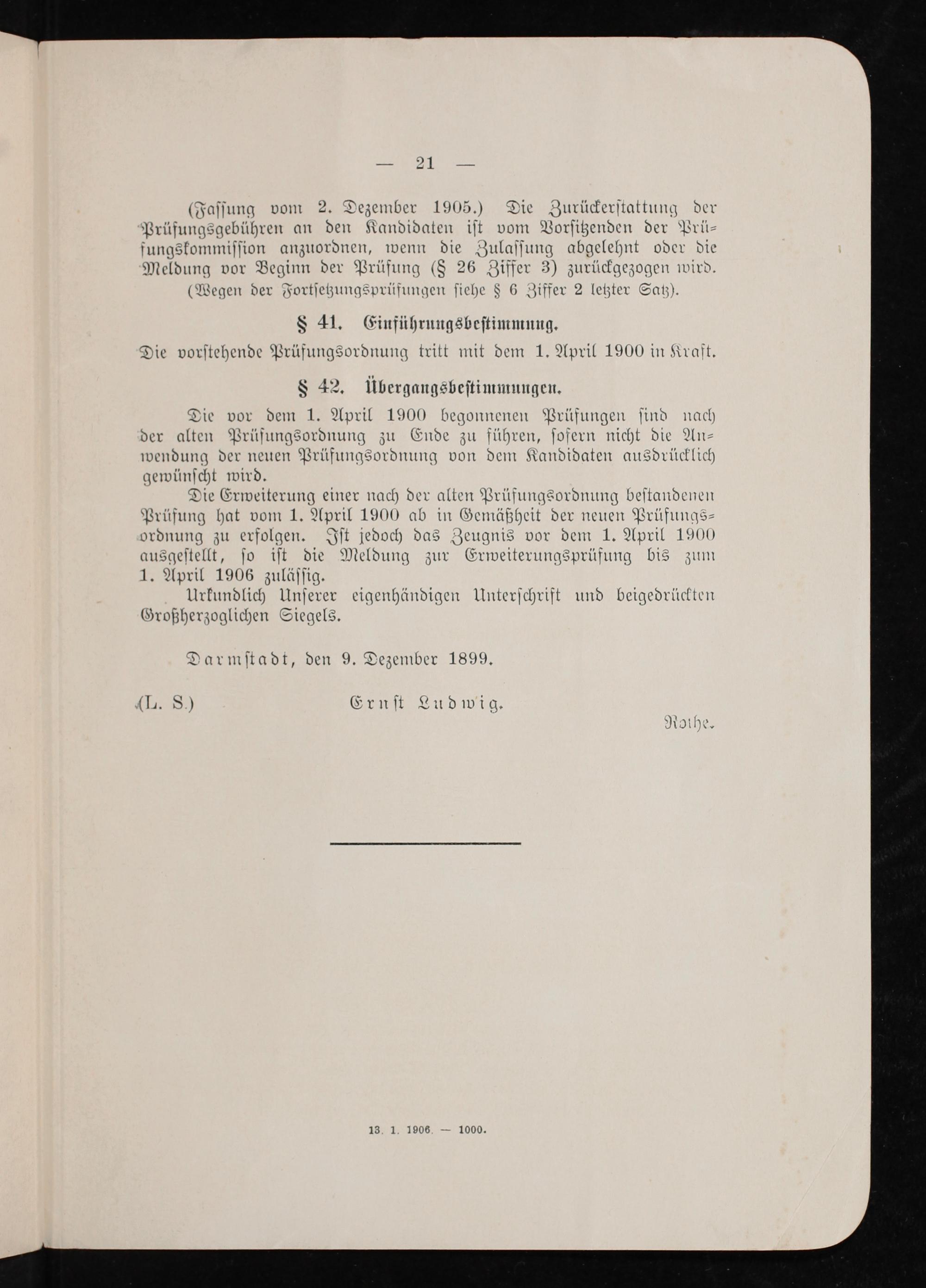 Die Erweiterung einer nach der alten Prüfungsordnung beſtandenen Prüfung hat vom 1. April 1900 ab in Gemäßheit der neuen Prüfungs⸗ ordnung zu erfolgen. Iſt jedoch das Zeugnis vor dem 1. April 1900 ausgeſtellt, ſo iſt die Meldung zur Erweiterungsprüfung bis zum 1. April 1906 zuläſſig.