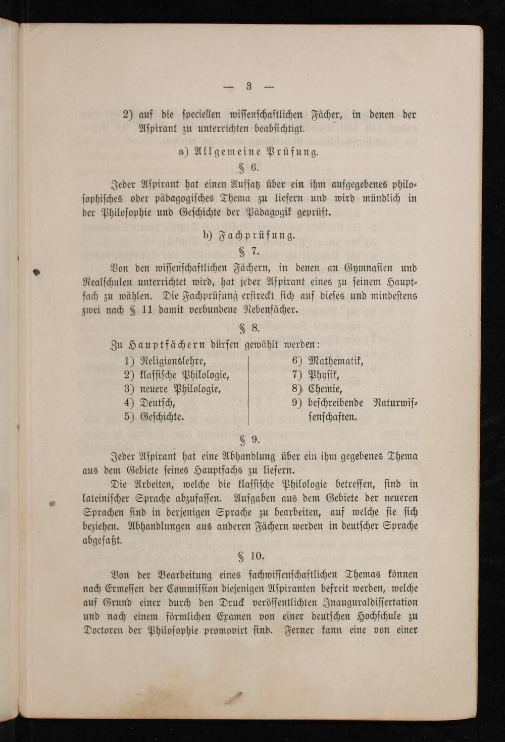 § 8. Zu Hauptfächern dürfen gewählt werden: 1) Religionslehre, 6) Mathematik, 2) klaſſiſche Philologie, 7) Phyſik, 3) neuere Philologie, 8) Chemie, 4) Deutſch, 9) beſchreibende Naturwiſ⸗ 5) Geſchichte. ſenſchaften. § 9.
