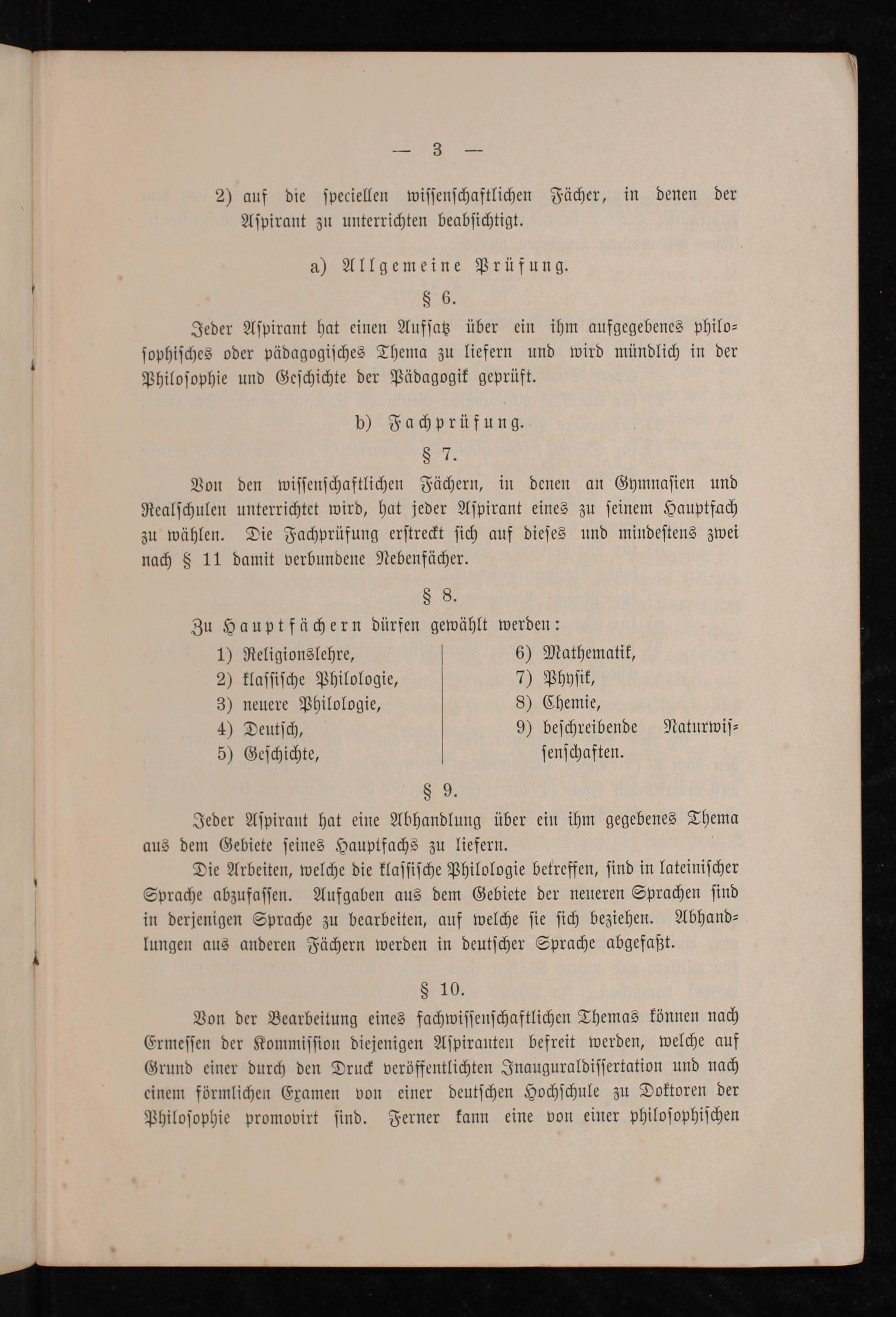 § 8. Zu Hauptfächern dürfen gewählt werden: 1) Religionslehre, 6) Mathematik, 2) klaſſiſche Philologie, 7) Phyſik, 3) neuere Philologie, 8) Chemie, 4) Deutſch, 9) beſchreibende Naturwiſ⸗ 5) Geſchichte, ſenſchaften. § 9.