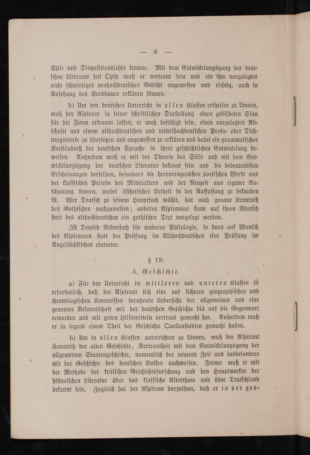 b) Um in allen Klaſſen unterrichten zu können, muß der Aſpirant Kenntniß der alten Geſchichte, Vertrautheit mit dem Entwickelungsgang der allgemeinen Staatengeſchichte, namentlich der neueren Zeit und insbeſondere mit der Geſchichte des deutſchen Volkes nachweiſen. Ferner muß er mit der Methode der kritiſchen Geſchichtsforſchung und den Hauptwerken der hiſtoriſchen Literatur über das klaſſiſche Altertum und über Deutſchland bekannt ſein. Zugleich hat der Aſpirant darzuthun, daß er in der geo⸗