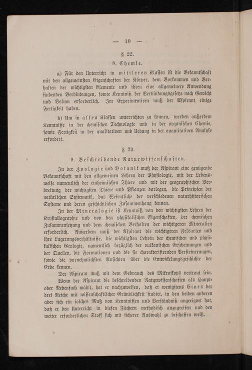 Wenn der Aſpirant die beſchreibenden Naturwiſſenſchaften als Haupt⸗ oder Nebenfach wählt, hat er nachzuweiſen, daß er wenigſtens Eines der drei Reiche mit wiſſenſchaftlicher Gründlichkeit ſtudirt, in den beiden anderen aber ſich ein ſolches Maß von Kenntniſſen und Verſtändniß angeeignet hat, daß er den Unterricht in dieſen Fächern methodiſch anzugreifen und den weiter erforderlichen Stoff ſich mit ſicherer Auswahl zu beſchaffen weiß.