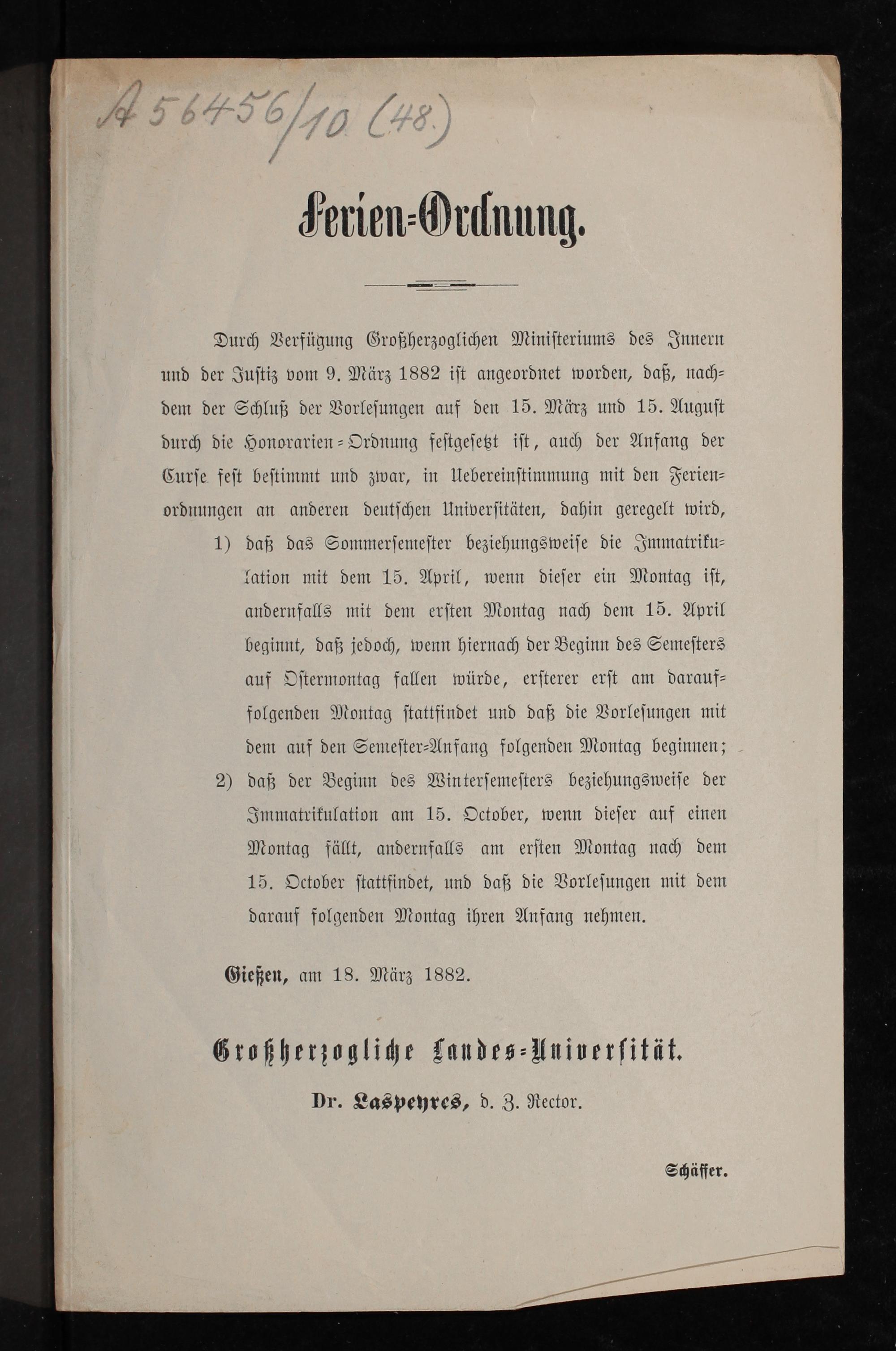 Durch Verfügung Großherzoglichen Miniſteriums des Innern und der Juſtiz vom 9. März 1882 iſt angeordnet worden, daß, nach⸗ dem der Schluß der Vorleſungen auf den 15. März und 15. Auguſt durch die Honorarien⸗Ordnung feſtgeſetzt iſt, auch der Anfang der Curſe feſt beſtimmt und zwar, in Uebereinſtimmung mit den Ferien⸗ ordnungen an anderen deutſchen Univerſitäten, dahin geregelt wird,
