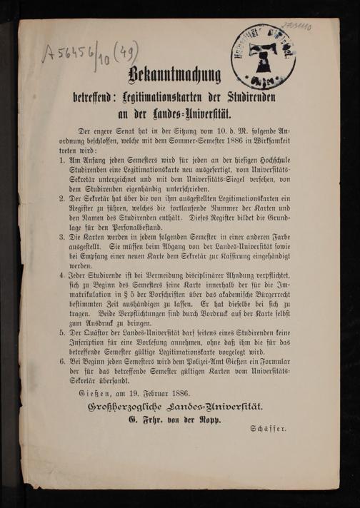 Am Anfang jeden Semeſters wird für jeden an der hieſigen Hochſchule Studirenden eine Legitimationskarte neu ausgefertigt, vom Univerſitäts⸗ Sekretär unterzeichnet und mit dem Univerſitäts⸗Siegel verſehen, von dem Studirenden eigenhändig unterſchrieben.