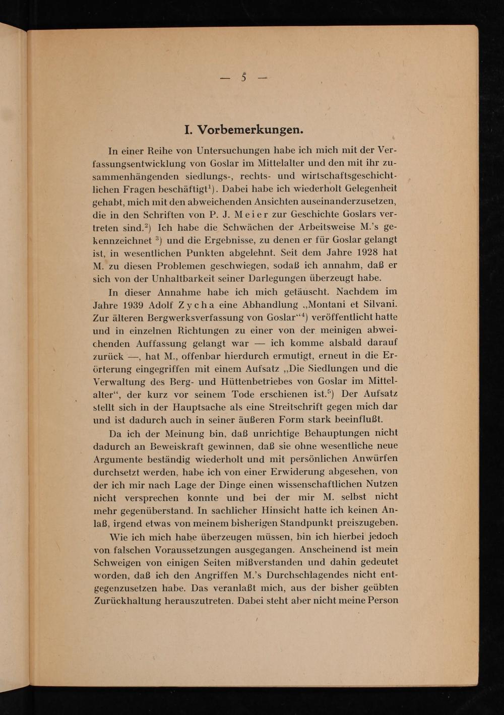 In einer Reihe von Untersuchungen habe ich mich mit der Ver- fassungsentwicklung von Goslar im Mittelalter und den mit ihr zu- sammenhängenden siedlungs-, rechts- und wirtschaftsgeschicht- lichen Fragen beschäftigt¹). Dabei habe ich wiederholt Gelegenheit gehabt, mich mit den abweichenden Ansichten auseinanderzusetzen, die in den Schriften von P. J. Meier zur Geschichte Goslars ver- treten sind. ²) Ich habe die Schwächen der Arbeitsweise M.'s ge- kennzeichnet ³) und die Ergebnisse, zu denen er für Goslar gelangt ist, in wesentlichen Punkten abgelehnt. Seit dem Jahre 1928 hat M. zu diesen Problemen geschwiegen, sodaß ich annahm, daß er sich von der Unhaltbarkeit seiner Darlegungen überzeugt habe.