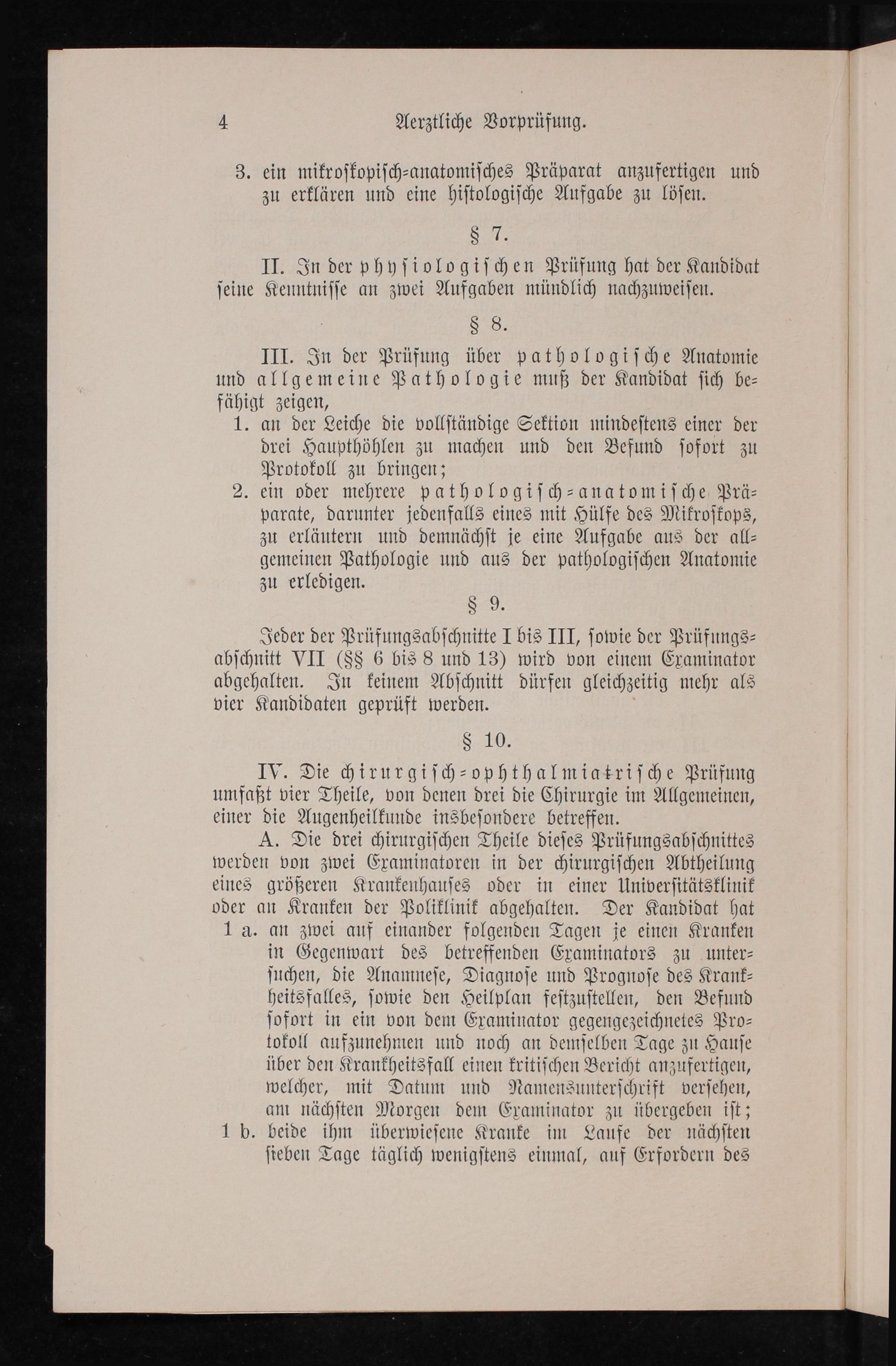 IV. Die chirurgiſch⸗ophthalmiatriſche Prüfung umfaßt vier Theile, von denen drei die Chirurgie im Allgemeinen, einer die Augenheilkunde insbeſondere betreffen.