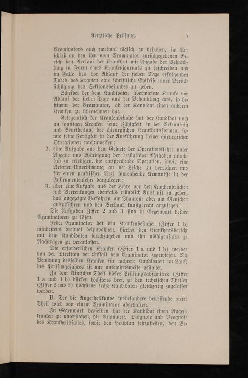 Jeder Examinator hat den Krankenbeſuchen(Ziffer 1 b) mindeſtens dreimal beizuwohnen, hierbei den Krankheitsbericht mit dem Kandidaten durchzugehen und ihn nöthigenfalls zu Nachträgen zu veranlaſſen.