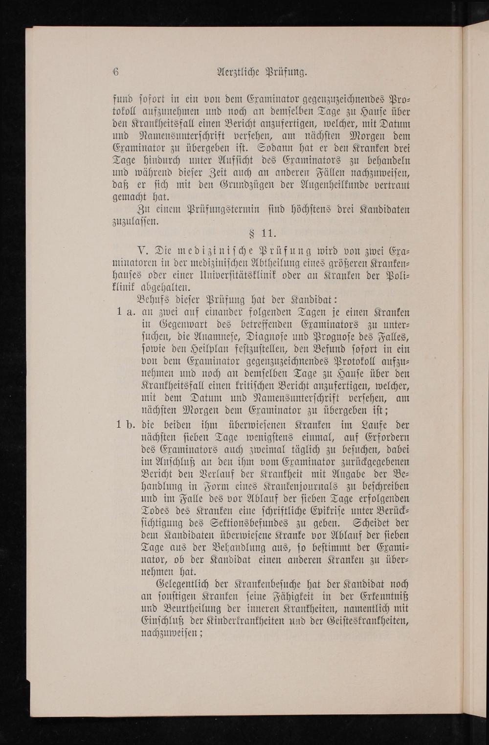 1 a. an zwei auf einander folgenden Tagen je einen Kranken in Gegenwart des betreffenden Examinators zu unter⸗ ſuchen, die Anamneſe, Diagnoſe und Prognoſe des Falles, ſowie den Heilplan feſtzuſtellen, den Befund ſofort in ein von dem Examinator gegenzuzeichnendes Protokoll aufzu⸗ nehmen und noch an demſelben Tage zu Hauſe über den Krankheitsfall einen kritiſchen Bericht anzufertigen, welcher, mit dem Datum und Namensunterſchrift verſehen, am nächſten Morgen dem Examinator zu übergeben iſt;