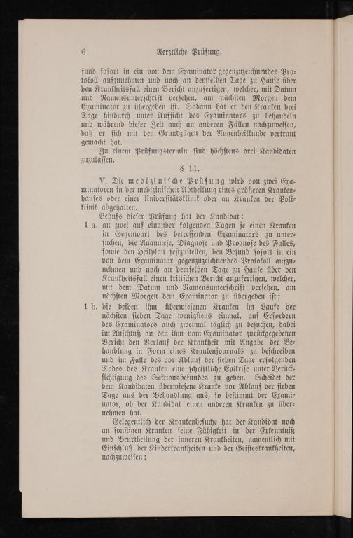 V. Die mediziniſche Prüfung wird von zwei Exa⸗ minatoren in der niedigenüſt en Abtheilung eines größeren Kranken⸗ hauſes oder einer Univerſitätsklinik oder an Kranken der Poli⸗ klinik abgehalten.