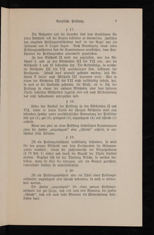 Die Aufgaben und die Kranken ſind dem Kandidaten für jeden Abſchnitt erſt bei Beginn deſſelben zu überweiſen. Zwiſchen den einzelnen Prüfungsabſchnitten darf in der Regel nur ein Zeitraum von 8 Tagen liegen. Nach Beendigung eines jeden Prüfungsabſchnittes ſind die Examinatoren verpflichtet, dem Vor⸗ ſitzenden die Prüfungsakten unverweilt zuzuſenden.