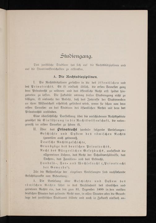 I. Die Rechtsdisplinen zerfallen in die des öffentlichen und des Privatrechts. Es iſt vielfach üblich, die erſten Semeſter ganz dem Privatrecht zu widmen und das öffentliche Recht erſt ſpäter hin⸗ zutreten zu laſſen. Die Fakultät vermag dieſen Studiengang nicht zu billigen, iſt vielmehr der Anſicht, daß das Intereſſe der Studierenden an ihrer Wiſſenſchaft erheblich geſördert wird, wenn ſie ſchon von dem erſten Semeſter an das Studium des öffentlichen Rechts mit dem des Privatrechts verbinden.