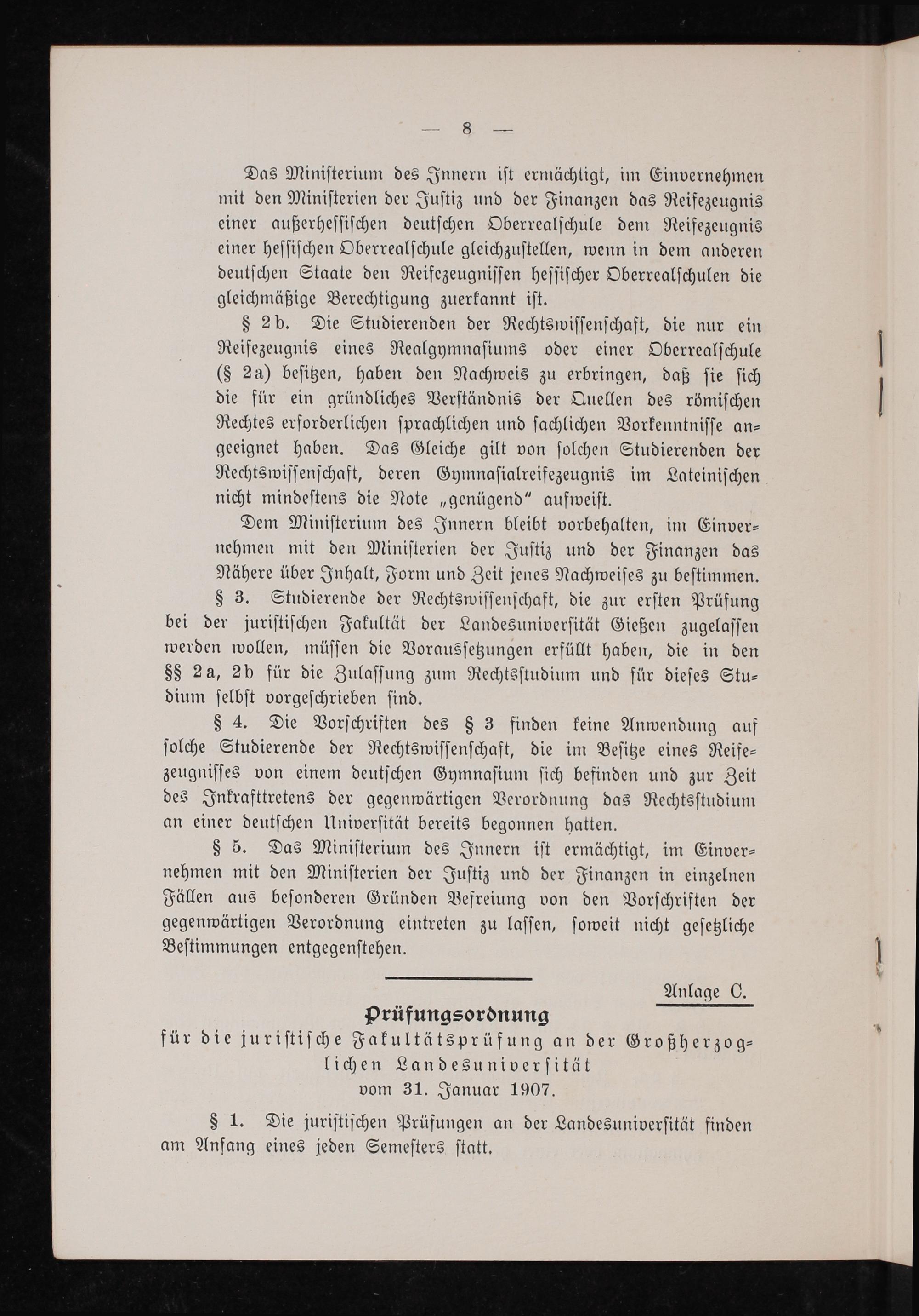 Anlage C. Prüfungsordnung““ für die juriſtiſche Fakultätsprüfung an der Großherzog⸗ lichen Landesuniverſität vom 31. Januar 1907.