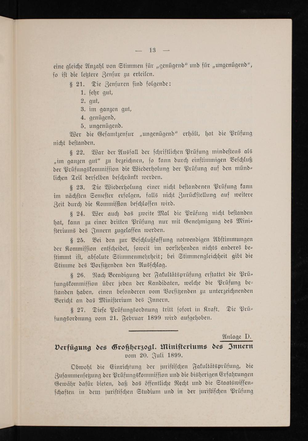 eine gleiche Anzahl von Stimmen für„genügend“ und für„ungenügend“, ſo iſt die letztere Zenſur zu erteilen. § 21. Die Zenſuren ſind folgende: 1. ſehr gut, 2. gut, 3. im ganzen gut, 4. genügend, 5. ungenügend. Wer die Geſamtzenſur„ungenügend“ erhält, hat die Prüfung nicht beſtanden. § 22. War der Ausfall der ſchriftlichen Prüfung mindeſtens als „im ganzen gut“ zu bezeichnen, ſo kann durch einſtimmigen Beſchluß der Prüfungskommiſſion die Wiederholung der Prüfung auf den münd⸗ lichen Teil derſelben beſchränkt werden. § 23. Die Wiederholung einer nicht beſtandenen Prüfung kann im nächſten Semeſter erfolgen, falls nicht Zurückſtellung auf weitere Zeit durch die Kommiſſion beſchloſſen wird. § 24. Wer auch das zweite Mal die Prüfung nicht beſtanden hat, kann zu einer dritten Prüfung nur mit Genehmigung des Mini⸗ ſteriums des Innern zugelaſſen werden. § 25. Bei den zur Beſchlußfaſſung notwendigen Abſtimmungen der Kommiſſion entſcheidet, ſoweit im vorſtehenden nichts anderes be⸗ ſtimmt iſt, abſolute Stimmenmehrheit; bei Stimmengleichheit gibt die Stimme des Vorſitzenden den Ausſchlag. § 26. Nach Beendigung der Fakultätsprüfung erſtattet die Prü⸗ fungskommiſſion über jeden der Kandidaten, welche die Prüfung be⸗ ſtanden haben, einen beſonderen vom Vorſitzenden zu unterzeichnenden Bericht an das Miniſterium des Innern. § 27. Dieſe Prüfungsordnung tritt ſofort in Kraft. Die Prü⸗ fungsordnung vom 21. Februar 1899 wird aufgehoben.