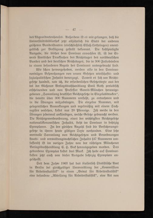 Wie ſchon hervorgehoben, werden alſo in den Seminar⸗ vorträgen Beſprechungen von neuen Geſetzen wirtſchafts⸗ und ſozialpolitiſchen Inhalts bevorzugt. Soweit es ſich um Reichs⸗ geſetze handelt, rate ich, die erforderlichen Geſetzestexte aus der bei der Gießener Verlagsbuchhandlung Emil Roth periodiſch erſcheinenden und von Profeſſor Gareis⸗München herausge⸗ gebenen„Sammlung deutſcher Reichsgeſetze in Einzelabdrucken“, die bereits über 300 Nummern umfaßt, zu entnehmen und in die Übungen mitzubringen. Die einzelne Nummer, mit gelegentlichen Anmerkungen und regelmäßig mit einem Sach— regiſter verſehen, koſtet nur 20 Pfennige. Ich werde in den Üübungen jedesmal ankündigen, welche Geſetze gebraucht werden. Die Reichsgewerbeordnung, eines der wichtigſten Reichsgeſetze nationalökonomiſchen Inhalts, ſteht im Seminar in ſechszig Exemplaren. In der gleichen Anzahl ſind die Verſicherungs⸗ geſetze in ihrem heute giltigen Texte vorhanden. Eine ſehr wertvolle Sammlung von Reichsgeſetzen und Verordnungen ſtaats- und verwaltungsrechtlichen Inhalts(47 Nummern um⸗ faſſend) iſt im vorigen Jahre von der rührigen Münchener Verlagsbuchhandlung C. H. Beck herausgegeben worden. Das gebundene Exemplar koſtet drei Mark. Ich habe auf Seminar⸗ koſten jetzt auch von dieſer Ausgabe ſechszig Exemplare an⸗ geſchafft.