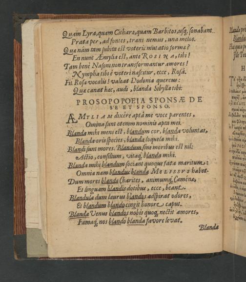 En nunc mylia est, ante RosI NX4⸗ fibi! Tam bene Naſoninon transformantur amores 4 MWympha tibi e veteri naſcitur, ecce, Roſa. Eit Roſa vocalis! valeat Dodonia qutrcus: Qua canat hæc, audi, blanda Sibylla tbi. PROSOPOPOEIA SPONSæÆ DE SIEITSPONSO.