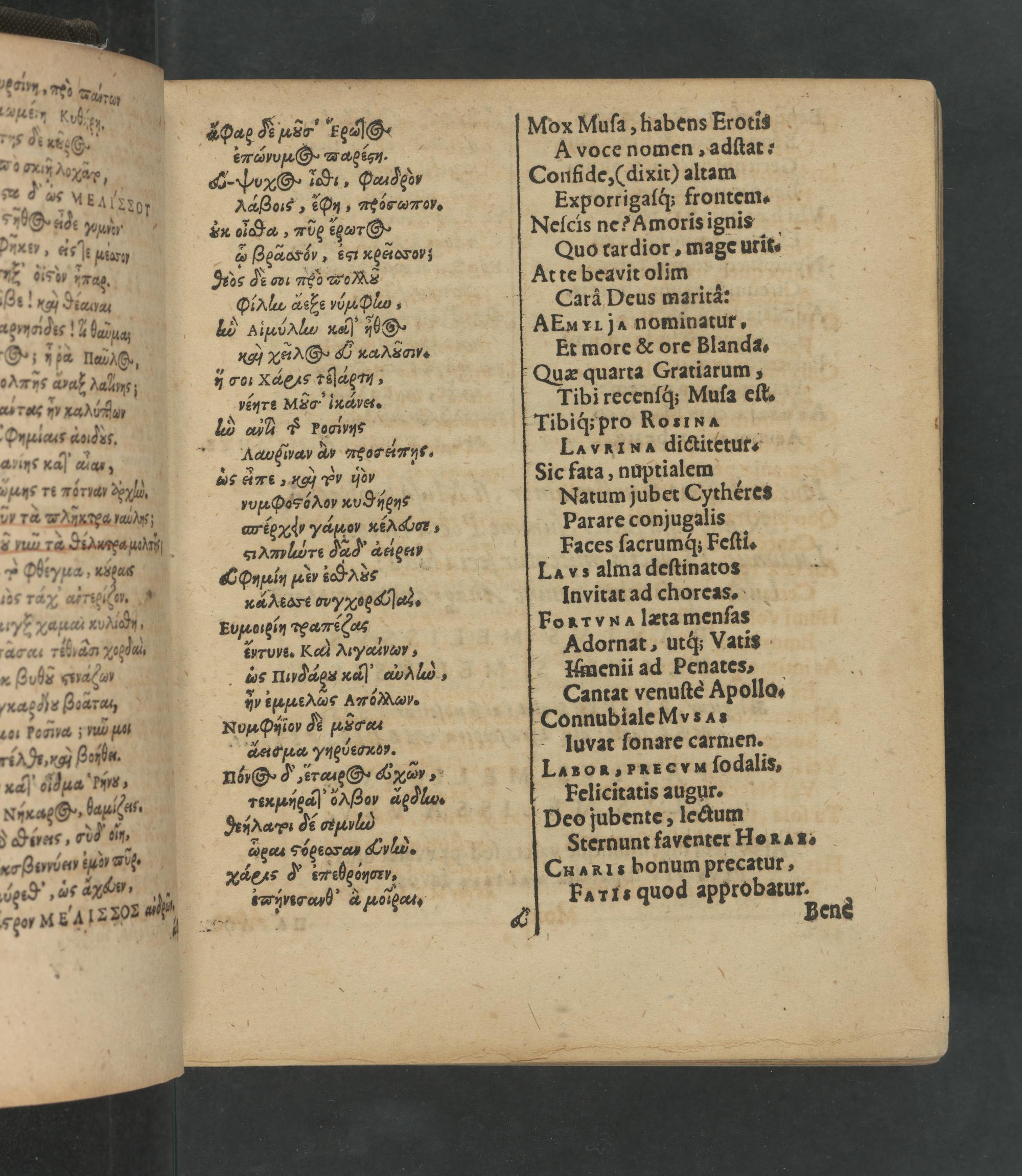 Mox Muſa, habens Erotis A voce nomen, adſtat- Confide,(dixit) altam Exporrigaſq́; frontem. Neſcis ne? Amoris ignis Quo tardior, maxge urit- Atte beavit olim Carâ Deus marità: AEurrja nominatur, Et more& ore Blanda. Quæ quarta Gratiarum, Tibi recenſq́; Muſa eſt. Tibiq; pro Rostna Layaiua dictitetur. Sic fata, nuptialem Natum jubet Cythéres Parare conjugalis Faces ſacrumꝗ́; Feſti. Lavs alma deſtinatos Invitat ad choreas. FolrvNa læta menſas A dornat, utq́; Vatis IImenii ad Penates, Cantat venuſté Apollo.