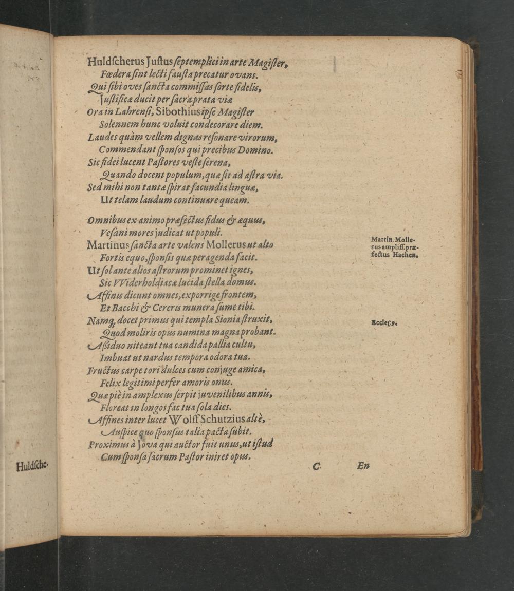 Omnibus ex animo præfectus fidus& aquus, Veſani mores judicat ut populi. Martinusſaucta arte valens Mollerus ut alto Forris equo, ſponſis quæ peragenda facit. Ut ſolante alios aſtrorum prominet ignes, Sic VViderholdiacæ lucida ſtella domus. Aau dicunt omnes, exporrige frontem, Et Baccbi& Cereru munera ſume tibi. Namq, docetprimus qui templa Sionia ſtruxit, geeleco Quod moliris opus numina magna probant. Aßiduo niteant tua candida pallia cultu, Imbuat ut nardus tempora odora tua. Fructus carpe tori dulces cum conjuge amica, Felix legitimi perfer amoris onus. Qu piè in amplexcus ſerpit juvenilibus annis, Floreat in lougos fac tua ſola dies. Afſines inter lucet Wolff Schutzius altè, Auſpice quo ſponſas talia pacta ſubit. Proximus à Jova qui auctor fuit unus, ut iſtud Cum ſponſa ſacrum Paſtor iniret opus.