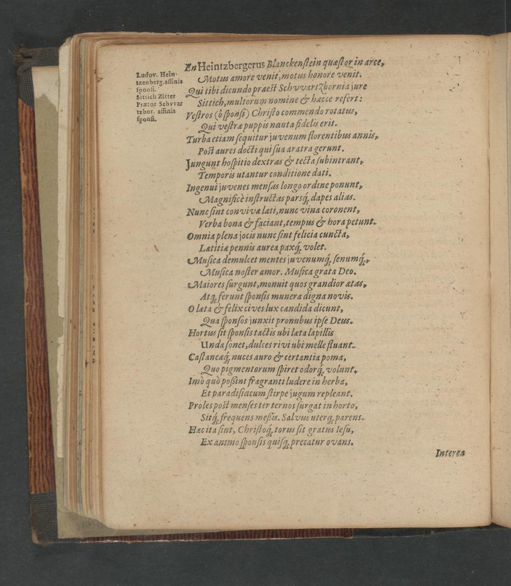 p Heintzbergerus Blanckenſtein quæſtot in arce, Ledgeüainns(Motuts amole Venit, motus bonore Denll. Poof. Qui tibi dicundo præeit Schvvart Tornia jure 8 Sittich Zitter.—.„ 5, Prætor Schvvar Sittich, multorum Voles ◻ᷣ◻ν hecce refert. La, Feſtros 6 ſonſi) C Briſto commendo Totatls, Qui veſtræ puppls nauta fidelis erit. Turba etiam ſequitur ju venum florentibus annis. Poft aures docti qui ſua aratra gerunt. Jungunt hoſpitio dextras Etecta ſubini rant⸗ Temporis utantur conditione dati. Ingenui juvenes men ſas longo ordine ponunt, Aagniftcè inſtructas parsip dapes alias. Nune ſint con vivæ leti, nunc Vina coronent, Verba bona& faciant, tempus& hora petunt. omnia plena jocis nunc ſint felicia cuncta, Latitiæ pennis aurea paxq. volet. b Auſica demulcet mentes uvenumq; ſenum;, Mufſica noſter amor. Muſica grata Deo. Maiores ſurgunt, monuit quos grandior ætas, Atg ferunt ſponſis munera digna novis. Oleta& felix ci ves lux candida dicunt, Qua ſponſos junxit pronubus ibſe Deus. Hortus ſit ſponſis tactis ubi leta lapillis Unda ſonet, dulces rivi ubi melle fluant- Caftaneac; nuces auro G'certantia poma, Quo pigmentorum ſpiret odorq volunt. Imò quò poſcint fragranti ladere in herba, Et paradiſiacum ſtirpe jugum repleant. Proles poit menſester ternos ſu rgat in horto, Sit; frequens meſcis. Sal vus uterq pareus. Eec ita ſint, Chriſtoq, torus ſit gratus leſu, ZEX antmo HPonſis quiſq. Prcbat ur OoᷣVAn. 3