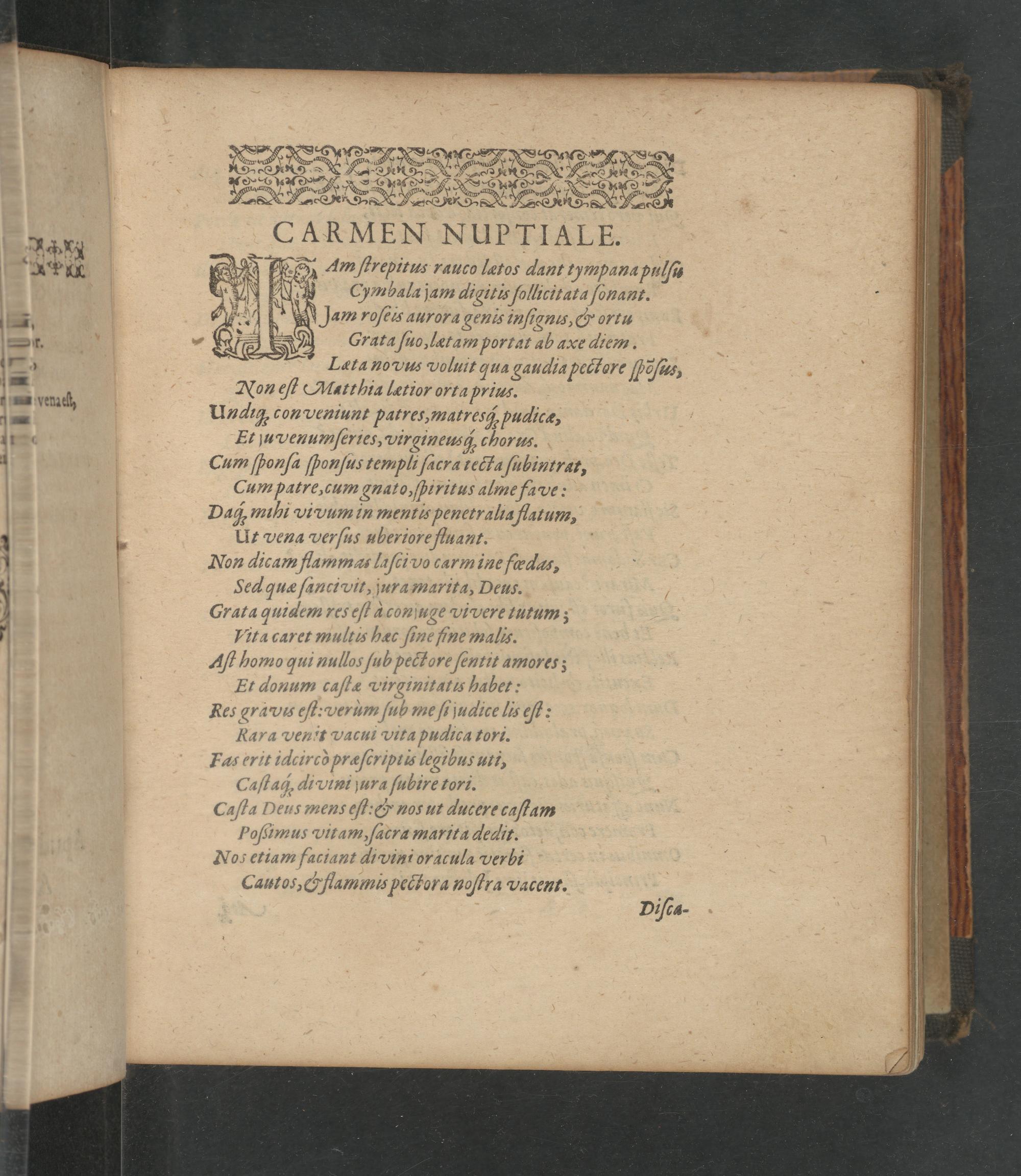 Non dicam flammas laſci vo carm ine fædas, Sed quæ, ſa inci vit, jura marita, Deus. Grata quidem res eſt à coniu ge7 ViVere tutum; 1 Vita caret multis hæc ſine fine malis. Aſt homo qui nullos ſub pectore ſe entit amores; Et donum caſtæ virginitatus habet: Res gravws eſt: Verum ſub me ſi judice lis eſt: Rara venit vacui vita pudica tori. Fas erit idcircs praæſcri Iptıs legibus uti, Caſtaq, di vini jura ſabine tori. Caſta Deus mens eſt:& nos ut ducere caſtam † 96 kmus Vitam, ſacra marita dedit. Nos etiam faciant A,uue oracula verbi Cautos,&flammis pectora noſtra vacent.