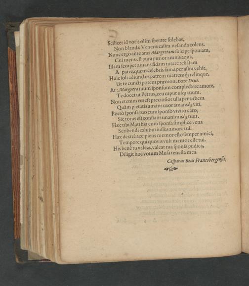 Te docet ut Petrus, ceu caput uſq; tuum. Non etenim res eſt precioſior ulla per orbem Quàm pietatis amans uxot amansq́; viri. Porrò ſponſa tuo cum[ponſo vivito caro, Sic torus eſtconſtans unani misq; tuus. Hæc tibi Matthia cum ſponſa ſimplice vena Scribendi exhibui iuſſus amoretui. Hæc dextrè accipiens memor eſto ſemper amici, Tempore qui quovis vult memor eſſe tui. Bis benè tu valeas, valeat tua ſponſa pudica, Diligit hoc votum Muſa tenella mea. Caſparus Beut⸗ Francobergenſin.