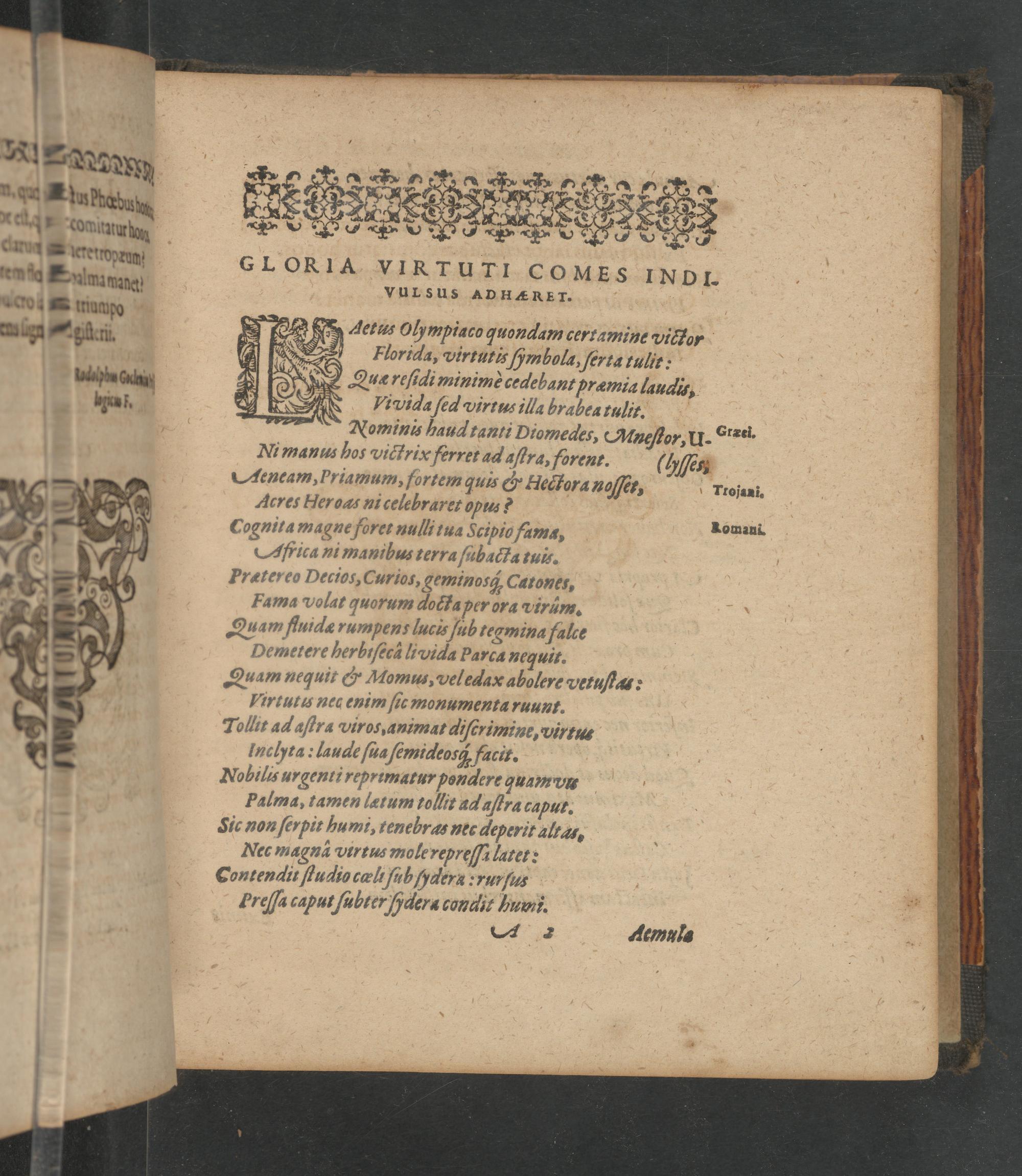 Florida, virtutis ſmbolc, ſerta tulit: Quc reſidi minimè cedebant præmia laudis, Vivida ſea Virtus illa brabea tulit. Nominis haud tanti Diomedes, Aneſtor, UI. Öræei. Ni manus hos victrix ferret ad aſtra, forent.(hiſen Aeneam, Priamum, fortem quts& Hectora Hnoſſer, Acres Heroas ni celebraret opus? Cognita magne foret nullitua Scipio fama, oand. Africa ni manibus terra ſubacta tui⸗. Prætereo Decios, Curios, geminosq;, Catones, Fama volat quorum docta per ora viràm. Quam fluide rumpen: lucis ſub tegmina falce Demetere herbiſeca livida Parca nequit. Quam nequit& Momuu, veledax abolere vetuftas: Virtutu nec enim ſic monumenta ruuut. Tollit adaſtra viros, animat aiſcrimine, virtus Inchta: laude ſua ſemideos; facit. Nobilis urgenti reprimatur pondere quam vu Palma, tamen lætum tollit adaſtra caput. Sic non ſerpit humi, tenebras nec deperit altan. Nec magnã virtus mole repreſſi latet: Contendit ſtudio cæli ſub Sydera ruſus Ereſſa caput ſubter dera condit huu. 2 demule