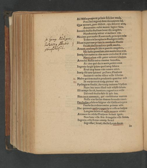 Ad Maſas properat primis feliciter annis,. Præclari ingenij dans documenta ſui. Quæ matura, puer didicit, vix diſceret ætas, Annosante volat mente ſagace ſuos. Intenſo ſtudio ſtudium leuat ille magiſtri, Monſtratisq́; inhiat vi meliore vijs. Maxima pars noſtri Reuerendi, principis aulæ b Teſtis eris locuples tu Rudigere mihi. Illum tu puerum prima in cunabula Phœbi Feciſti doctis noſcere poſſe modis. Aeuum conſumpſit ſub te puerile magiſtro, Hic ludo quondam cum moderator eras. Iamq́; ſuis numeris tùm mens creſcebat& ætas Marticolam viſit patre volente ſcholam. Artes hic ſtudio miro rimatur honeſtas, Ac cito quò ducit meta petita venit Ingenio ſurgit ſpinas quaſcunq; labore Eruit atq; bono vita tenore nitet. Iamq́; illi toto ſpiranti pectore Phœbum Succurrit varias viſere velle ſcholas. Multa quidem multis prudentia quæritur oris In varijs terris arsq; paratur ait. Pyrhagoræ ſimilis, fortemq́; imitatus Vlyſſem Nunc hoc nunc illud vult adijſſe ſolum. Illi nempe ſat eſt, homines cognoſcere velle Diſcendi ſtudio fidit& ipſe ſuo. Non curat nummos, qui conſolentur euntem Nulla viæ forſan damna ferenda timet. Parrhæſias celebres fulgent vbi Gallica ſceptra Fauſto ſuccedens omine primus adit. Huc quamuis nudus pauꝑerq́; acceſſerat hoſpes Longam ſolata eſt nulla moneta viam: Attamen in calido Phœbeus ferbuit ignis, Non hunc vlla ſitis ſtrangulat vlla fames. Ingenio celſo fretus venaq́; feraci