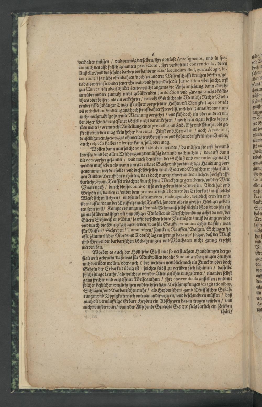 lie auch den alſo falſch genanten prætectum, jhre verbottene convenricula, deren Anſteller/ vnd die ſchoͤne darbey vorhandene actal ſecunduùm illud, qui malè agit, lu- cem odit,) ja nicht offenbahren/ noch zu anderer Wiſſenſchafft bringen dorffen/ ge rad als weren ſie vnder jener Gewalt/ vnd hetten dieſe die Jurisdiction vber ſolche/ erſt zur Univerſitaͤt abgeſchickte Leute/ welche angemaßte Anheimſchung dann der jh⸗ nen uͤber andere zumahl nicht gebuͤhrenden Jurildiction vnd Zwangs nichts koͤſtli⸗ chers oder beſſers als ein verkehrter/ ſo wohl Goͤttliche als Weltliche Rechte Violi⸗ render/ Mißthaͤtiger Eingriff in jhrer vorgeſetzter Hohen⸗vñ Obrigkeit lu perioritaͤt vñ urisdiction /vnd ein gantz hochſtraffbahrer Frevel iſ/ welcher(zumal/ wann nun⸗ mehr nochmahlige ſo ernſte Warnung vorgehet/ vnd ſich doch ein oder anderer vn⸗ bendiger Gottsvergeſſener Geſell nicht daran kehren/ noch ſein eigen beſtes beden⸗