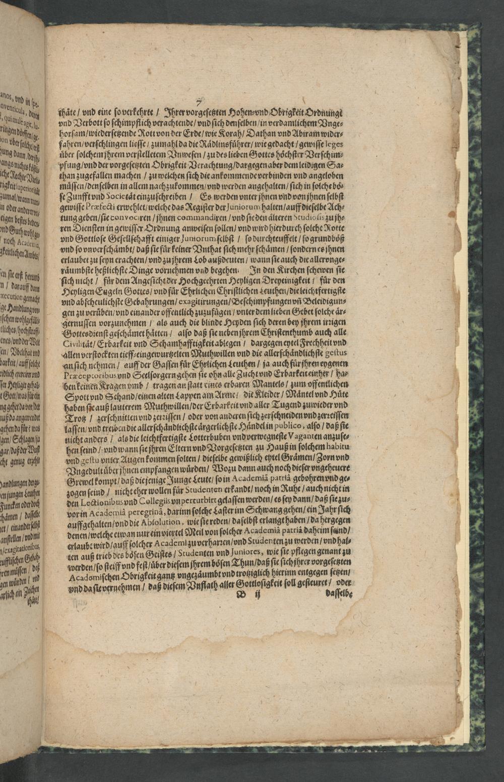 vorin Academià peregrinà, darinn ſolche La ſter im Schwang gehen/ ein Jahr ſich auffgehalten/ vnd die Ablolution; wie ſie reden/ daſelbſt erlaugt haben/ da hergegen denen/ welche etwan nur ein viertel Meil von ſolcher Academiã batriã daheim ſand/ erlaubt wird/ auff ſolcher Academizu verharꝛen/ vnd Studenten zu werden/ vnd hal⸗ ten auß trieb des boͤſen Geiſtes Studenten vnd Juniores, wie ſie pflegen genant zu werden/ ſ ſteiff vnd feſt/uͤber dieſem jhremoͤſen Thun/ daß ſie ſichihrer vorgeſetzten