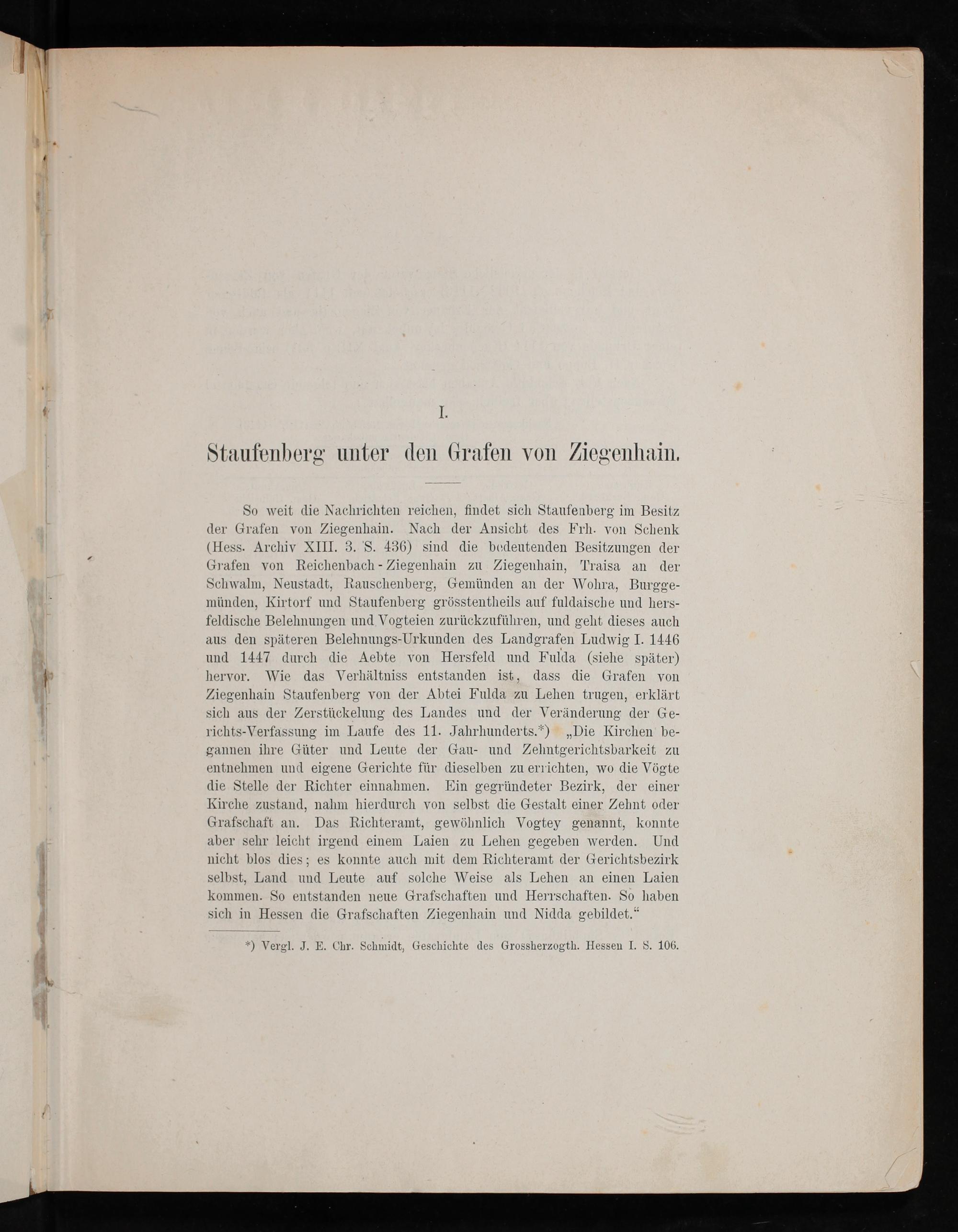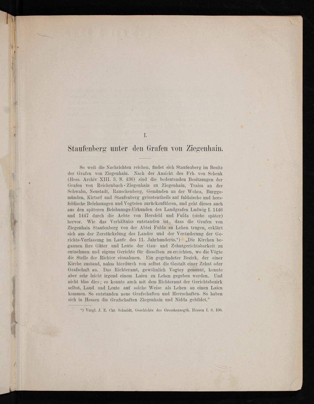So weit die Nachrichten reichen, findet sich Staufenberg im Besitz der Grafen von Ziegenhain. Nach der Ansicht des Frh. von Schenk (Hess. Archiv XIII. 3.'S. 436) sind die bedeutenden Besitzungen der Grafen von Reichenbach- Ziesenhain zu Ziegenhain, Traisa an der Schwalm, Neustadt, Rauschenberg, Gemünden an der Wohra, Burgee- münden, Kirtorf und Staufenberg grösstentheils auf fuldaische und hers- feldische Belehnungen und Vogteien zurückzuführen, und geht dieses auch aus den späteren Belehnungs-Urkunden des Landgrafen Ludwig I. 1446 und 1447 durch die Aebte von Hersfeld und Fulda(siehe später) hervor. Wie das Verhältniss entstanden ist, dass die Grafen von Ziegenhain Staufenberg von der Abtei Fulda zu Lehen trugen, erklärt sich aus der Zerstückelung des Landes und der Veränderung der Ge- richts-Verfassung im Laufe des 11. Jahrhunderts.”)„Die Kirchen be- gannen ihre Güter und Leute der Gau- und Zehntgerichtsbarkeit zu entnehmen und eigene Gerichte für dieselben zu errichten, wo die Vögte die Stelle der Richter einnahmen. Ein gegründeter Bezirk, der einer Kirche zustand, nahm hierdurch von selbst die Gestalt einer Zehnt oder Grafschaft an. Das Richteramt, gewöhnlich Vogtey genannt, konnte aber sehr leicht irgend einem Laien zu Lehen gegeben werden. Und nicht blos dies; es konnte auch mit dem Richteramt der Gerichtsbezirk selbst, Land und Leute auf solche Weise als Lehen an einen Laien kommen. So entstanden neue Grafschaften und Herrschaften. So haben sich in Hessen die Grafschaften Ziegenhain und Nidda gebildet.“