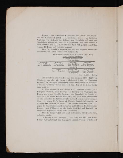 Gozmar I, der erweisliche Stammvater der Grafen von Ziegen- hain und Reichenbach(1062—1116) erscheint seit 1111 als fuldischer Vogt, und war vielleicht der Erbauer von Ziegenhain und auch von Staufenberg. Gozmar’sI Gemahlin ist unbekannt, wohl aber werden in einer Urkunde von 1114(Kuchenbecker, Anal. XII. p. 321) seine Söhne Gozmar Il, Boppo und Gottfried genannt.