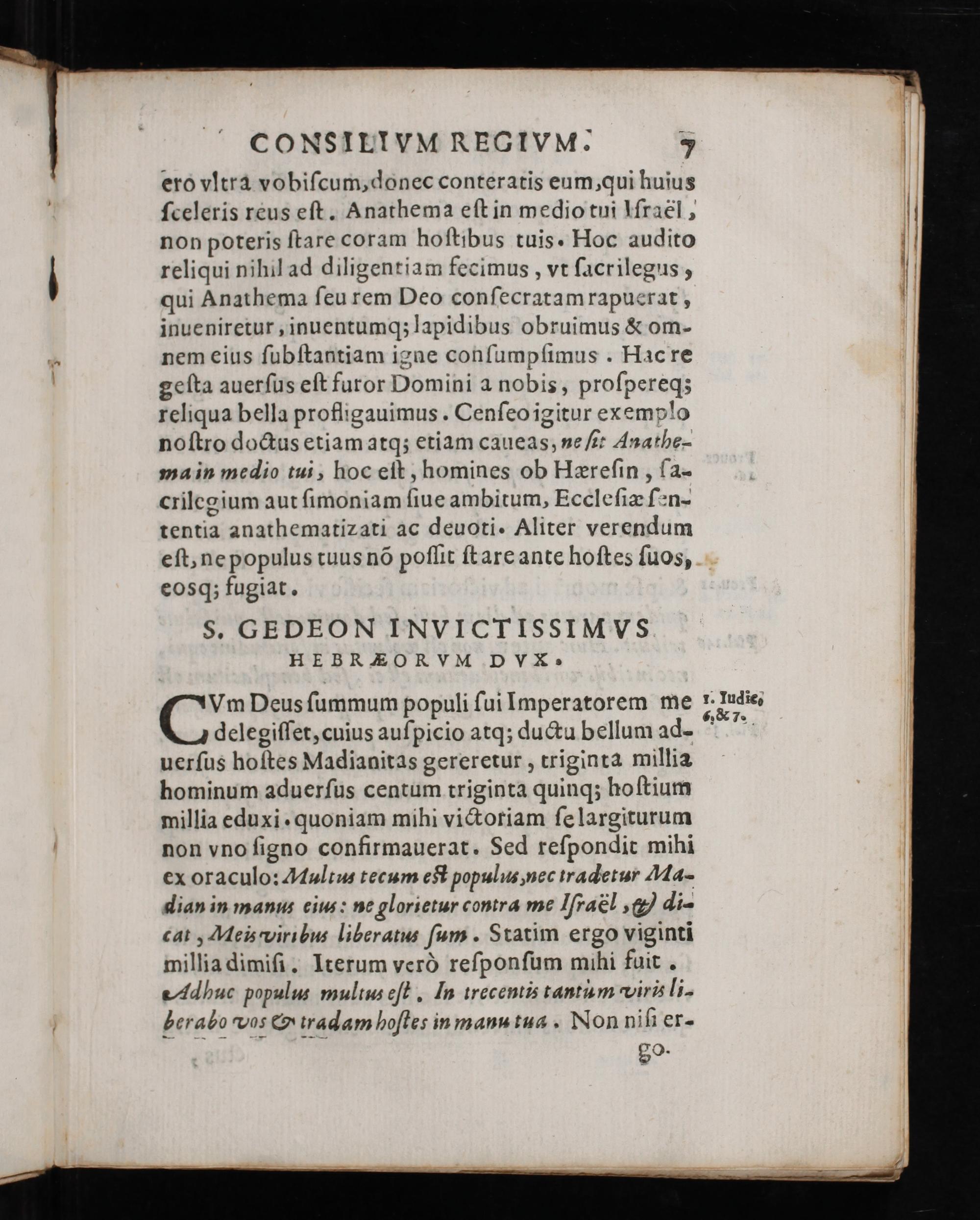 — Deus ſummum populi ſui Imperatorem me delegiſſet, cuius auſpicio atqʒ ductu bellum ad- uerſus hoſtes Madianitas gereretur, triginta millia hominum aduerſus centum triginta quinq; hoſtium millia eduxi · quoniam mihi victoriam ſe largiturum non vno ſigno confirmauerat. Sed reſpondit mihi ex oraculo: Multus tecum e populus nec tradetur Ma- dian in manus eiun ne glorietur contra me ſaẽl di- cat Mei virilus liberatus ſum. Statim ergo viginti millia dimiſi. Iterum verò reſponſum mihi fuit.